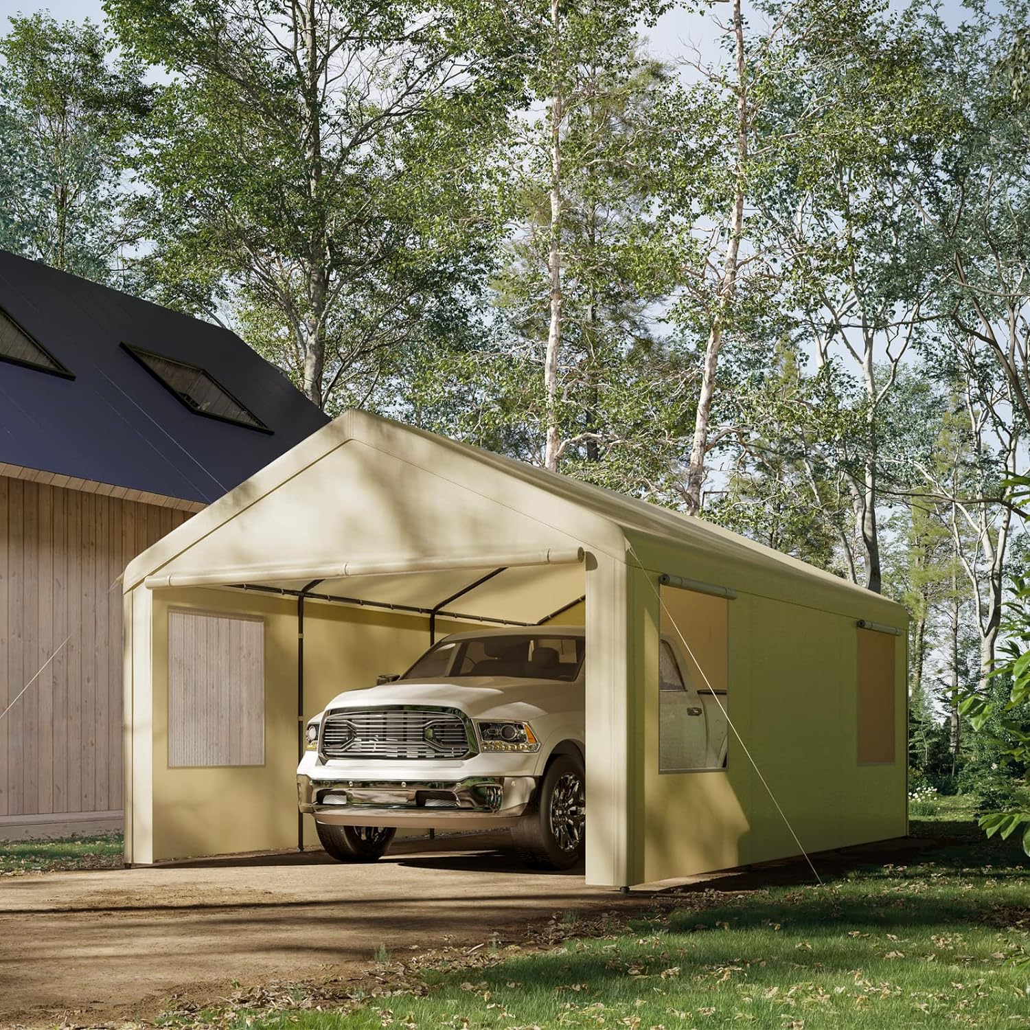 Gardesol Carport, 12'x20' extra grande y resistente con ventanas enrollables ventiladas, garaje portátil con paredes laterales y puertas extraíbles para coche, camión, SUV, toldo para coche con lona para todas las estaciones, color beige