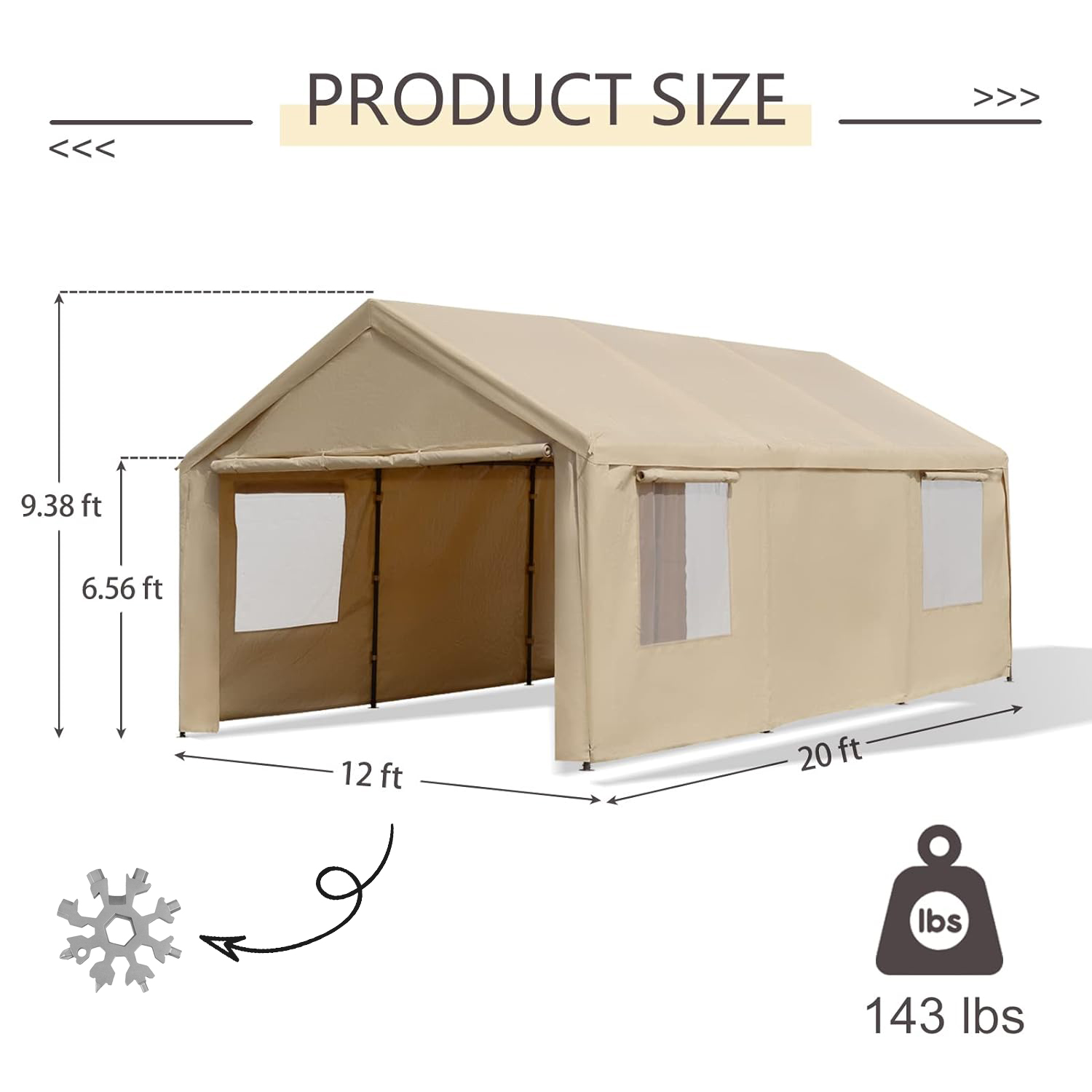 Gardesol Carport, 12'x20' extra grande y resistente con ventanas enrollables ventiladas, garaje portátil con paredes laterales y puertas extraíbles para coche, camión, SUV, toldo para coche con lona para todas las estaciones, color beige