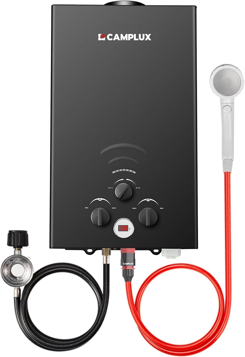 CAMPLUX Calentador de agua portátil a gas propano de 2,64 GPM, calentador de agua para camping sin tanque para exteriores de 68.000 BTU con pantalla digital, color blanco