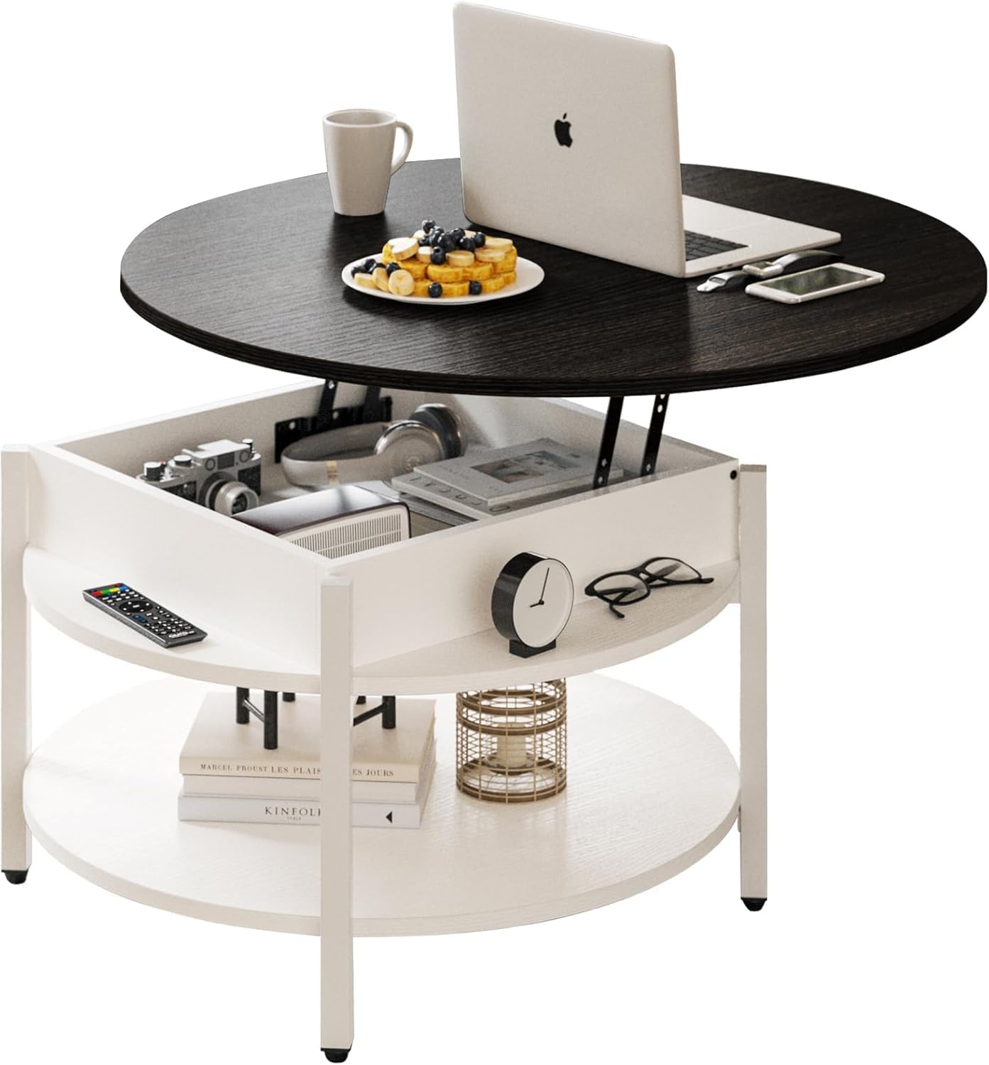 FABATO Mesa de Centro para Sala Redonda - Elevable de Madera - 2 Niveles - Varilla de Estrés - Ideal como Mesa para Cafe o Mesa Auxiliar (Blanco)