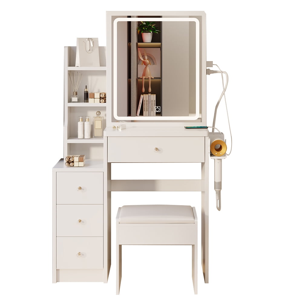 Tocador de maquillaje, tocador con 4 cajones y estantes de almacenamiento, mesa de maquillaje con espejo iluminado LED, 3 modos de color y ajustable, para dormitorio