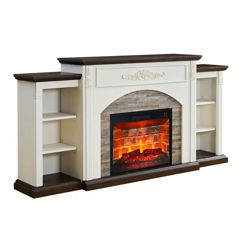 Soporte para TV de construcción duradera, color blanco vintage con repisa, se adapta a televisores de 80", chimenea eléctrica de 72"
