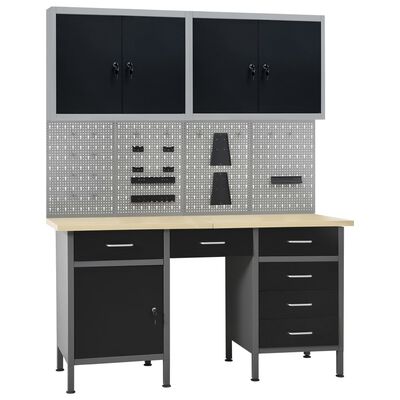 Mesa de trabajo con cuatro paneles de pared y dos armarios.