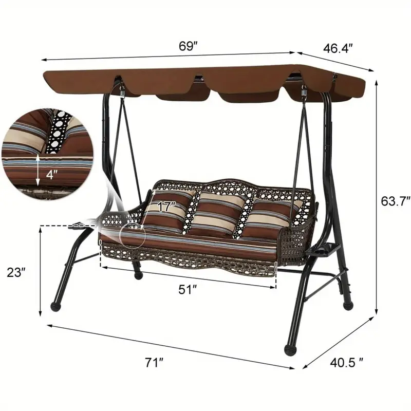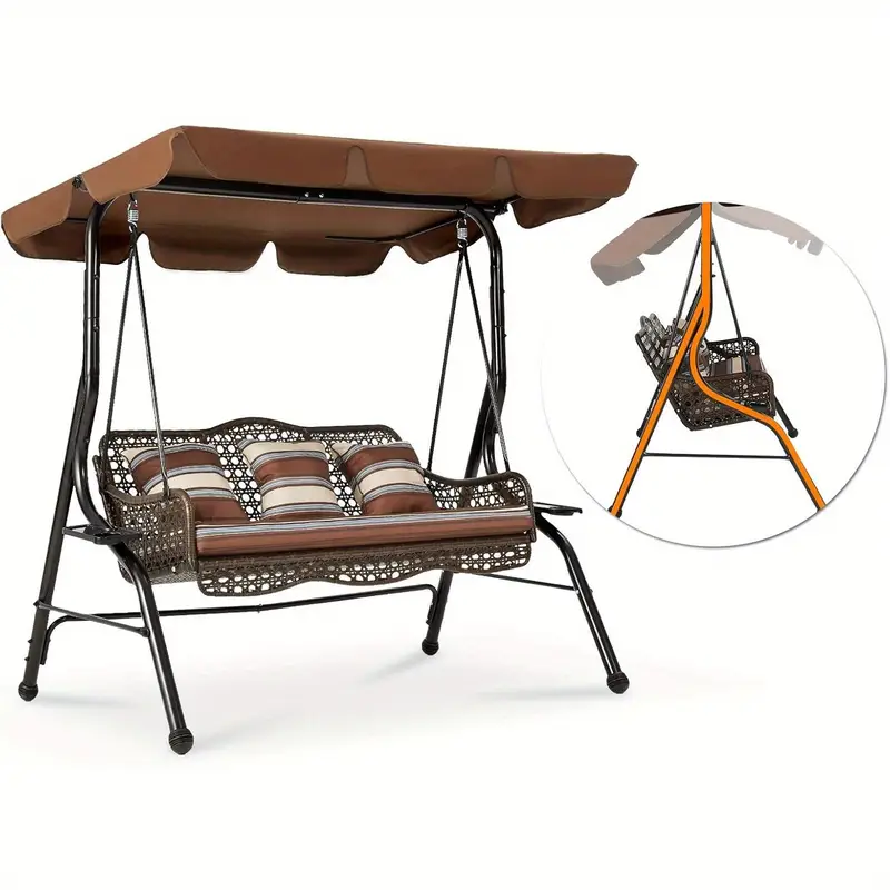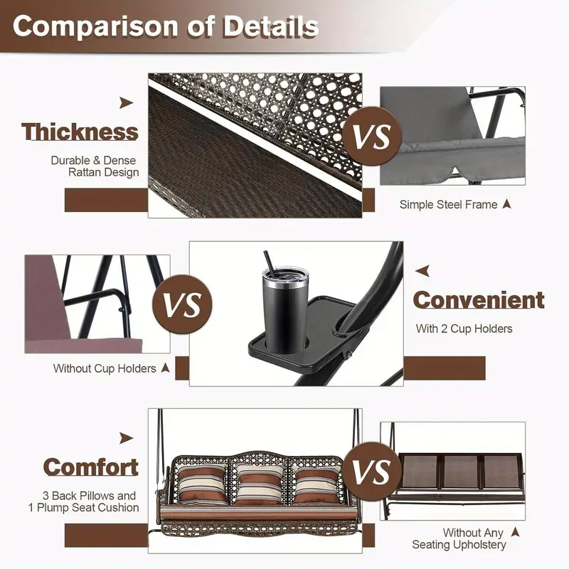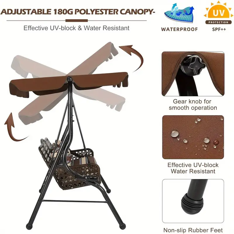 Este producto presenta un diseño distintivo de ratán, lo que hace que la silla columpio para patio con soporte sea resistente a la luz solar y al agua, fácil de limpiar e ideal para entornos al aire libre.