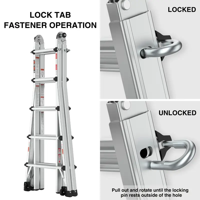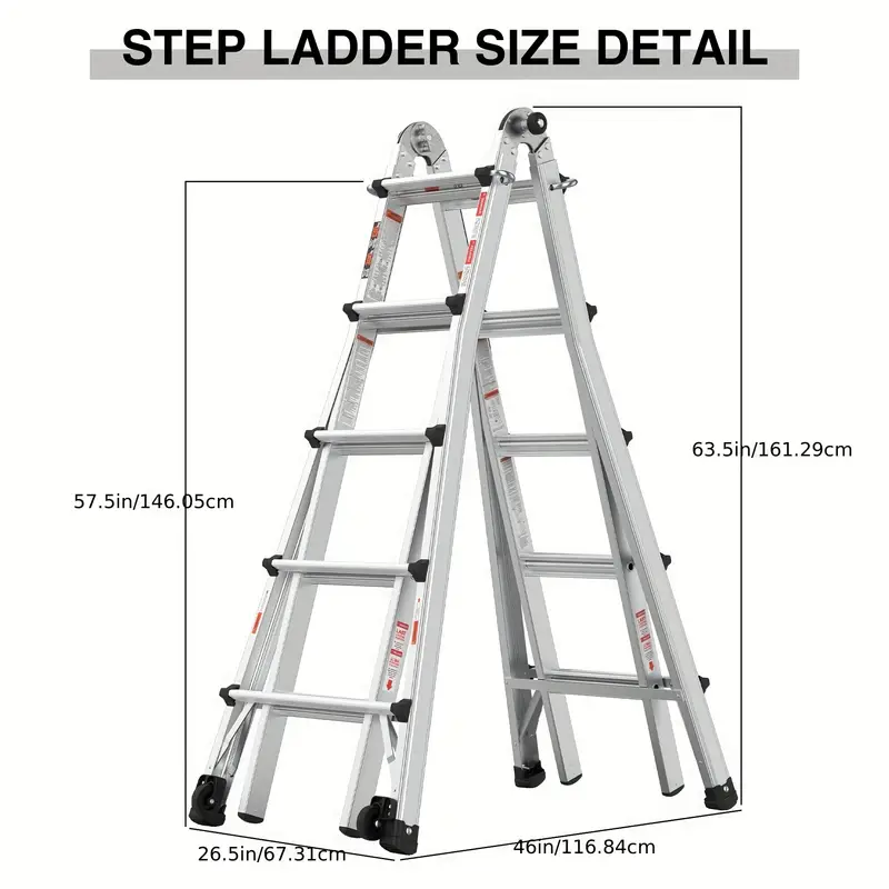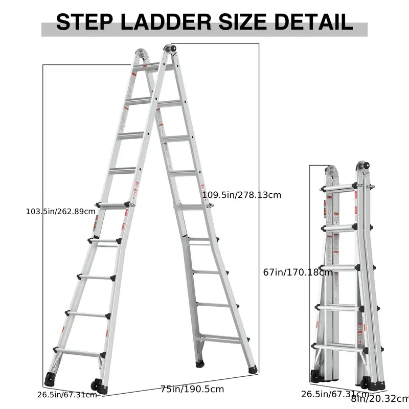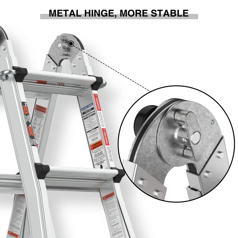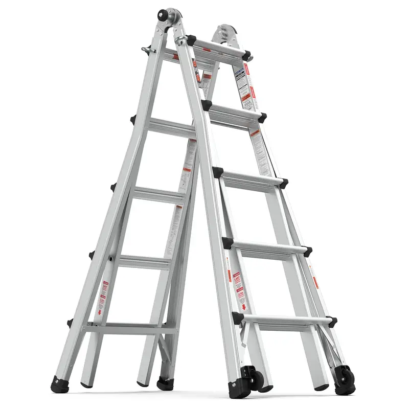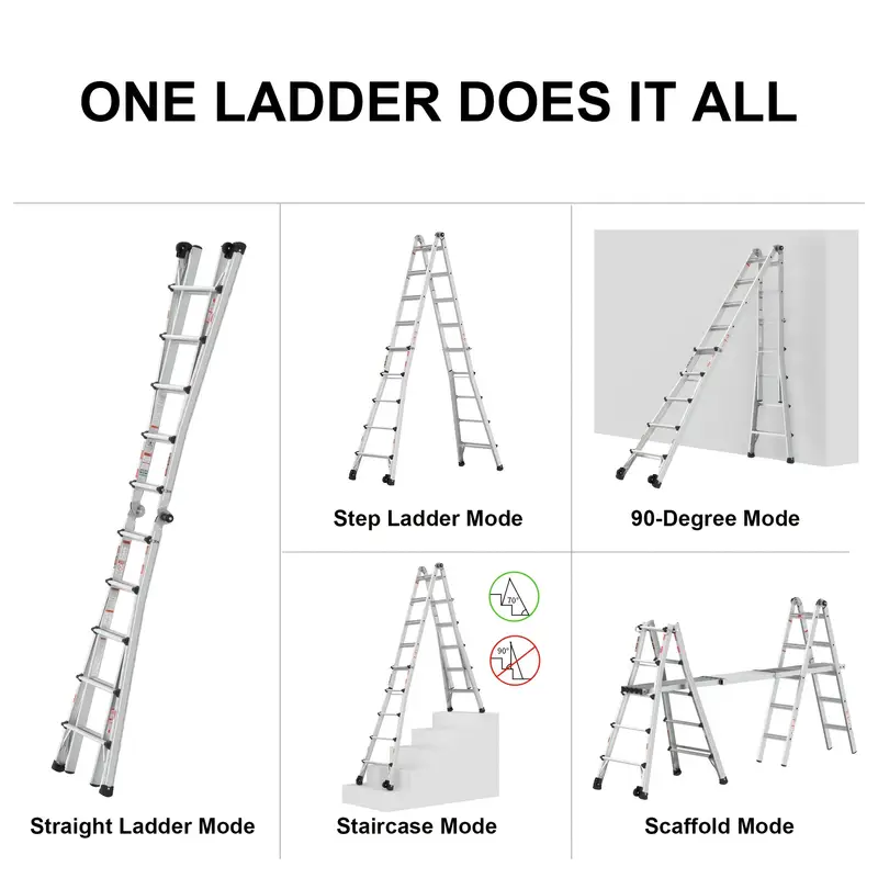 Nuestra escalera versátil puede cambiar fácilmente a diferentes xformas, lo que la hace ideal para una variedad de trabajos y entornos. Ya sea que necesite una escalera con estructura en A, extensible, de caballete y tablón, en ángulo de 90 grados o en forma de escalera, esta escalera está equipada para manejarlo todo.