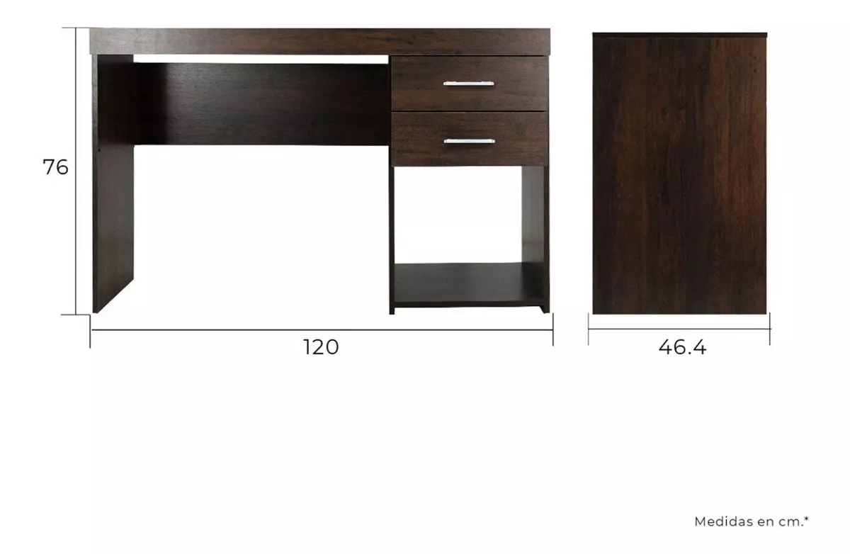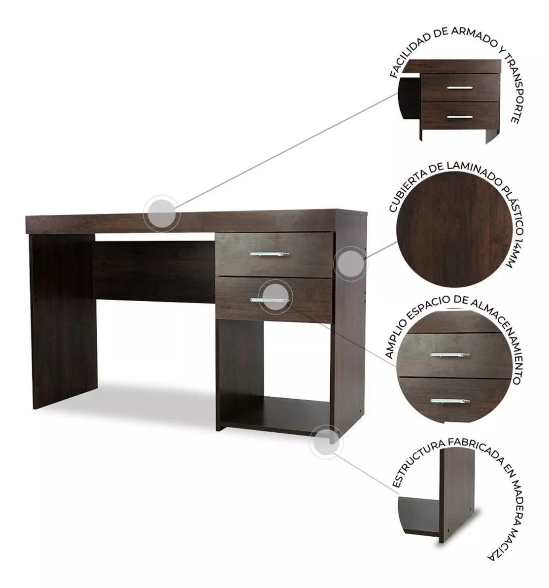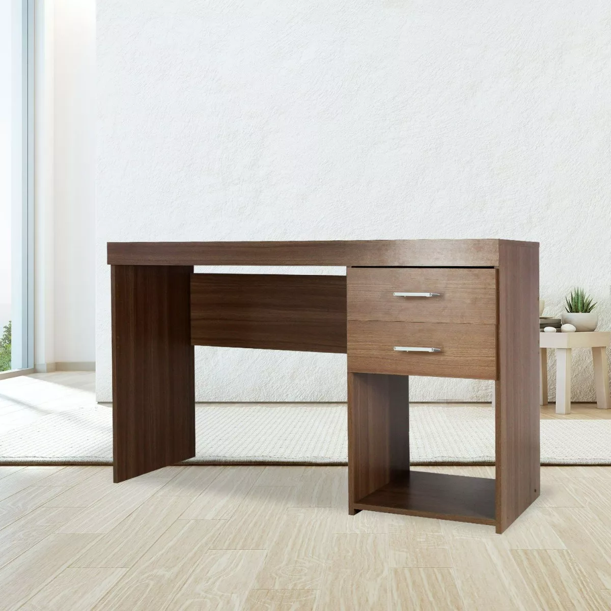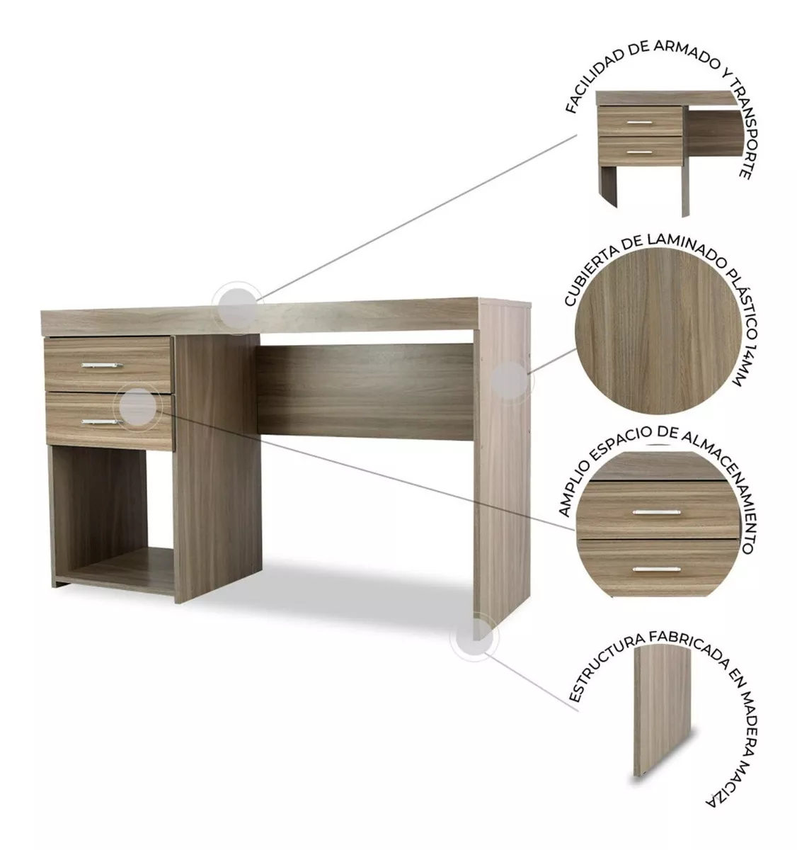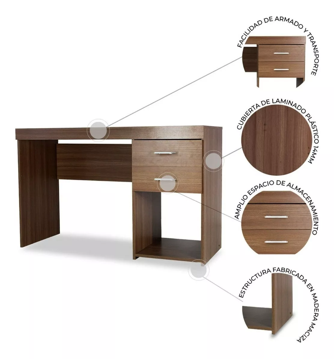 Este escritorio multifuncional es ideal para actividades estudiantiles y laborales. Su diseño incluye una amplia superficie de trabajo, dos cajones en el lado derecho y un espacio adicional para exhibición o almacenamiento debajo de la mesa.