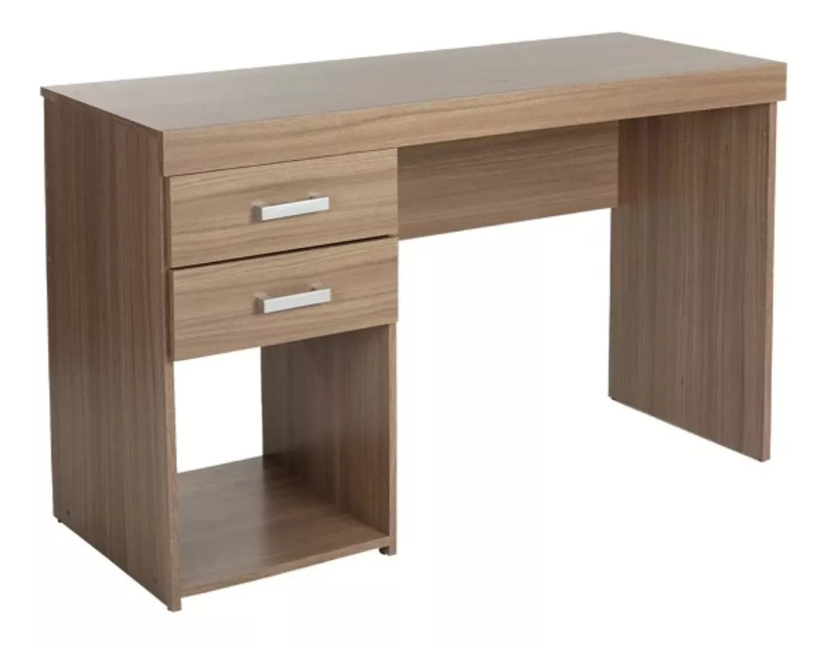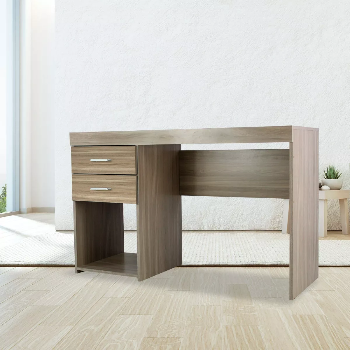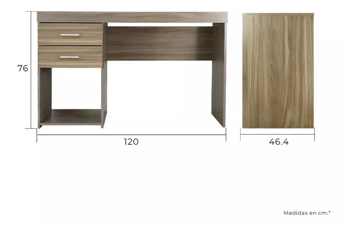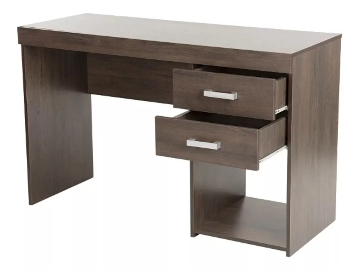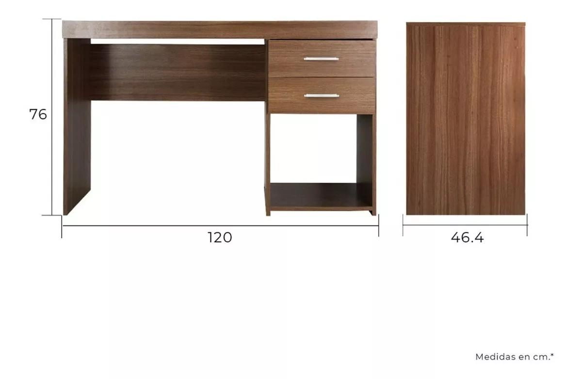 Este escritorio multifuncional es ideal para actividades estudiantiles y laborales. Su diseño incluye una amplia superficie de trabajo, dos cajones en el lado derecho y un espacio adicional para exhibición o almacenamiento debajo de la mesa.