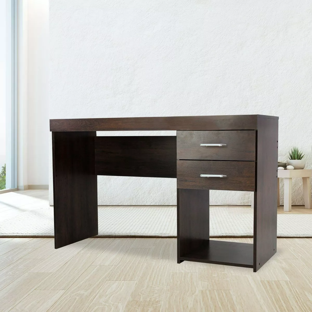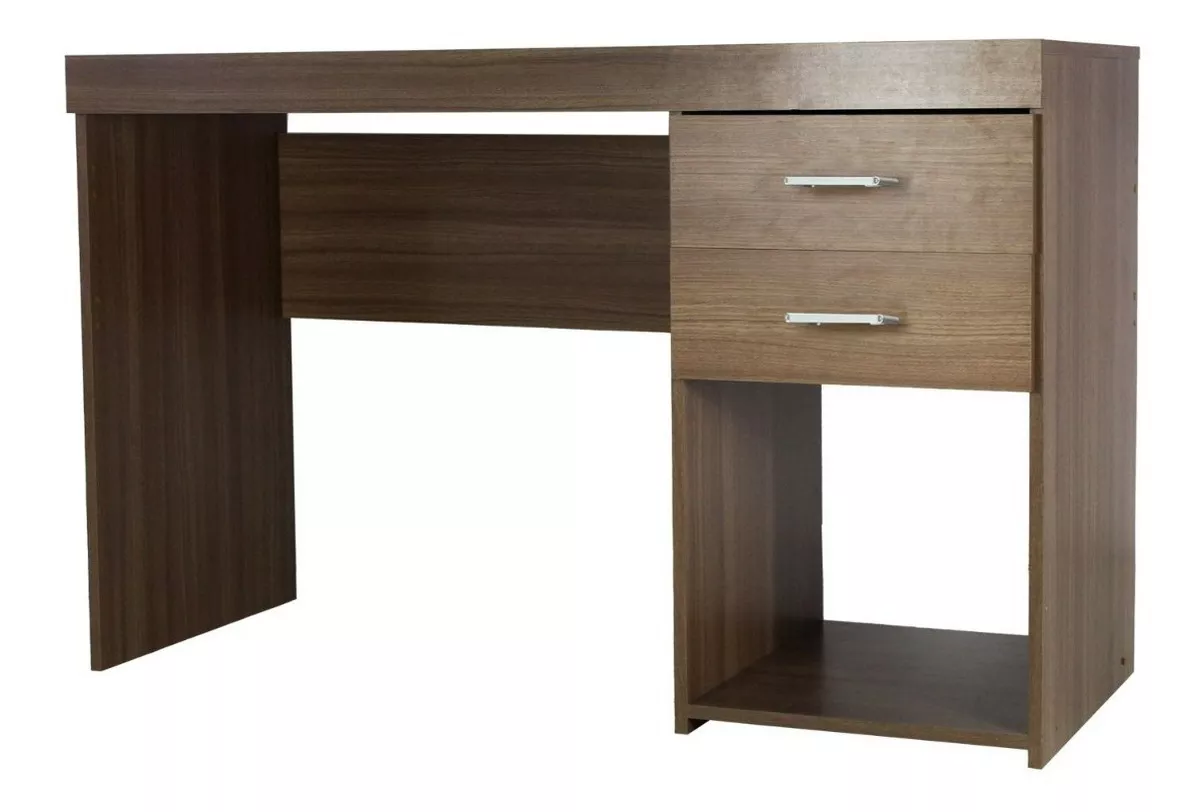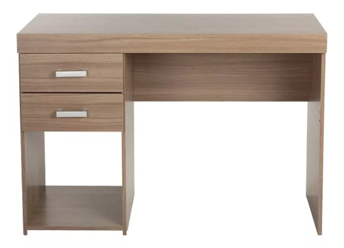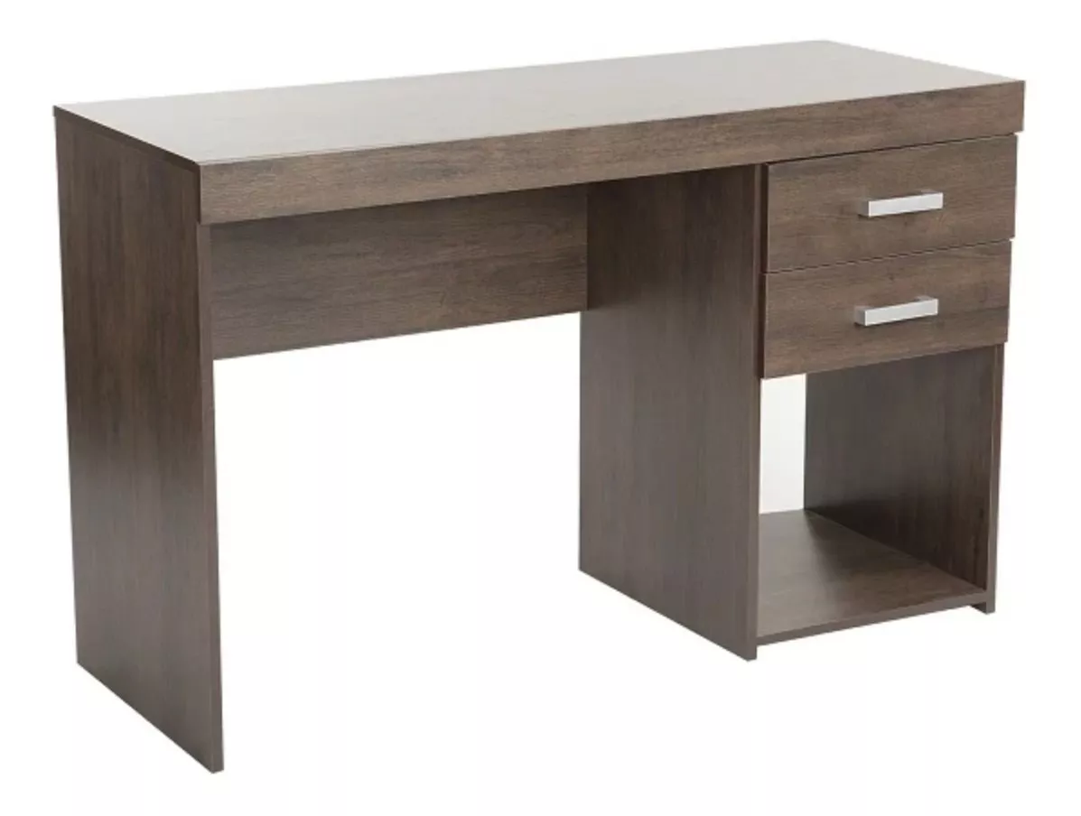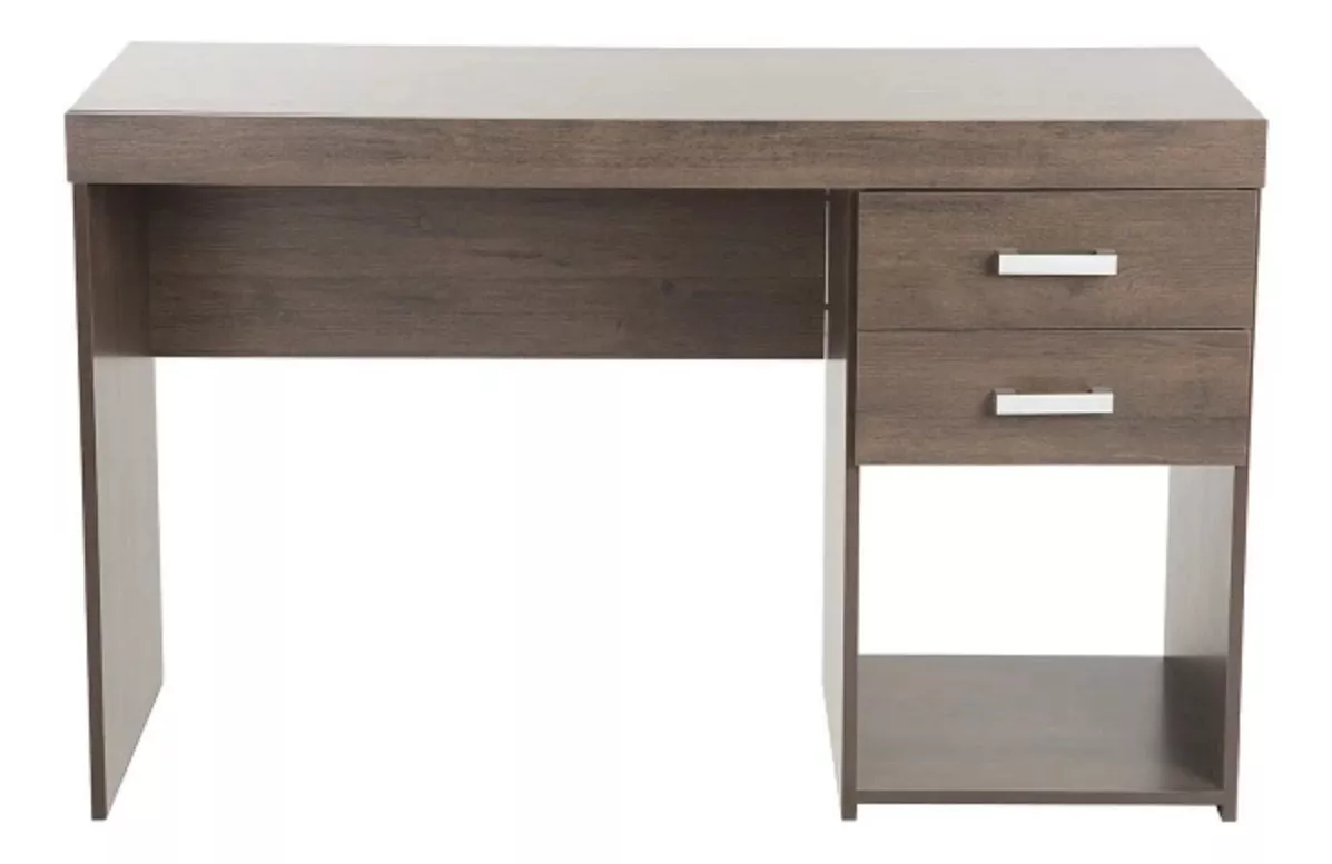 Este escritorio multifuncional es ideal para actividades estudiantiles y laborales. Su diseño incluye una amplia superficie de trabajo, dos cajones en el lado derecho y un espacio adicional para exhibición o almacenamiento debajo de la mesa.