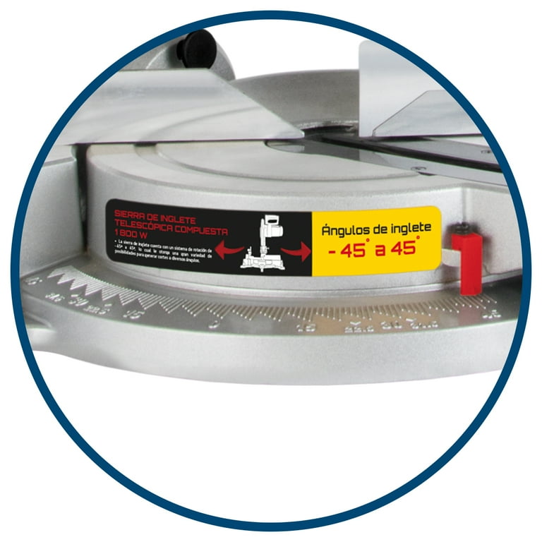 ESPECIFICAIONES TÉCNICAS: Tensión / frecuencia: 127 V ~ 60 Hz Potencia: 1 800 W Corriente: 15 A Velocidad (sin carga): 4 500 rev / min Peso: 15.190 kg. Capacidad Corte Izquierda: 45° Bisel e Inglete. Profundidad de corte: 90° (340 x 90 mm), 45° (240 x 45 mm). Diámetro del disco: 10" (255 mm) Diámetro del eje: 1" (25.4 mm) TIEMPO DE OPERACIÓN: 50 minutos de trabajo x 20 minutos de descanso. Máximo diario: 6 horas.