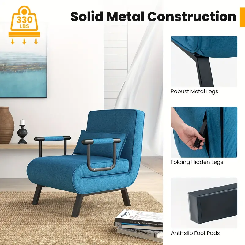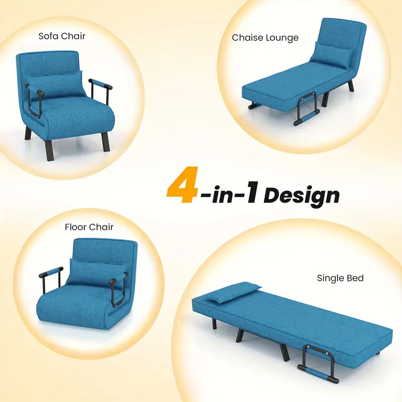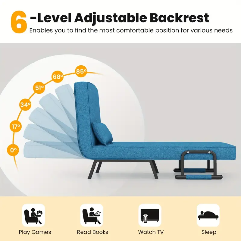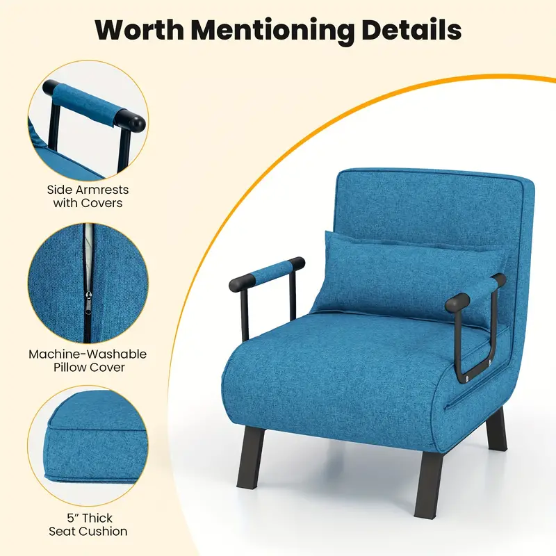 Esta silla cama es una opción ideal para ti o tu familia. Puede ser utilizada como cama, silla de sofá y tumbona, satisfaciendo todas tus necesidades de asiento o descanso. Los cojines del asiento están hechos de tela de lino premium y esponja elástica para una experiencia de asiento cómoda. Además, la almohada suave también añade más comodidad. También puedes colocar tus brazos en los reposabrazos para relajarte. Además, la funda de almohada removible es fácil de limpiar.