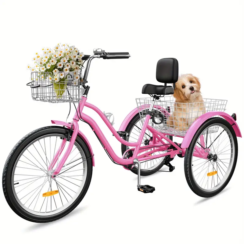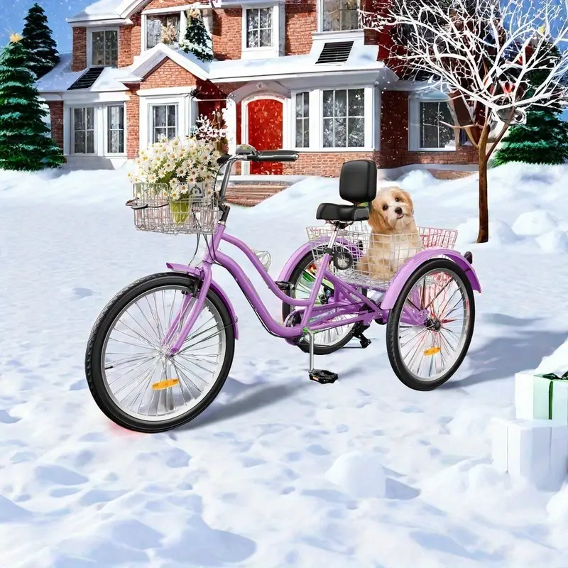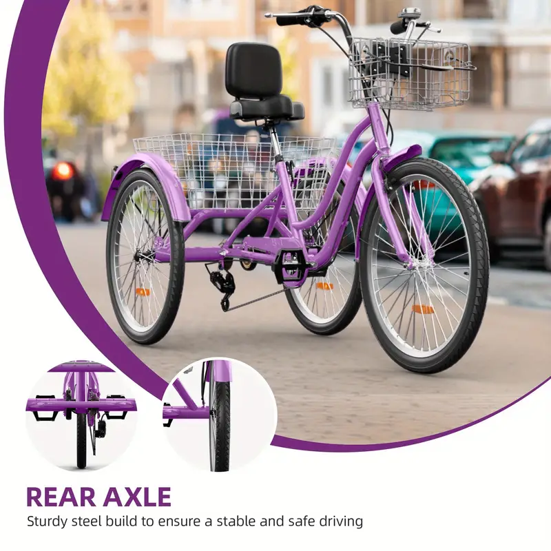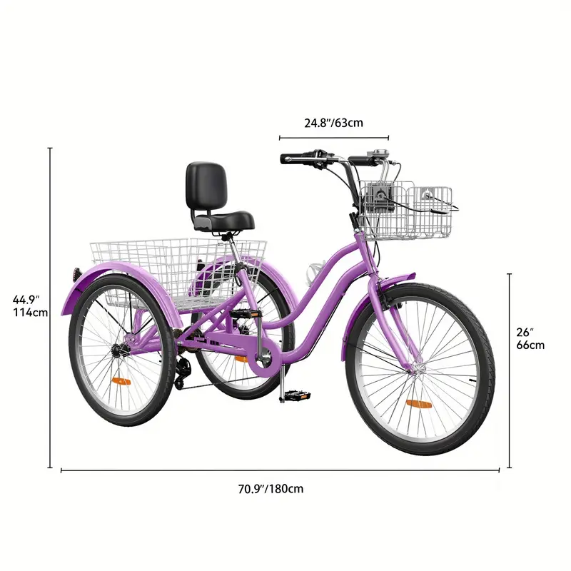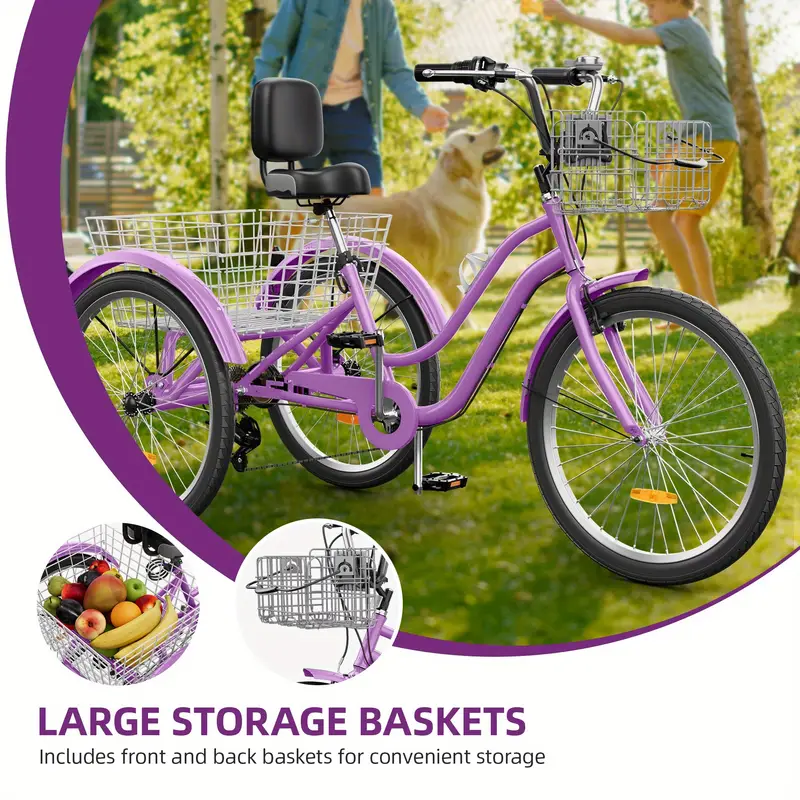 Triciclo para Adultos de 26 Pulgadas y 7 Velocidades, Bicicleta de Paseo de 3 Ruedas con Paso Bajo y Asiento Grande, Respaldo, Cestas Delanteras y Traseras para Personas Mayores, Mujeres, Hombres