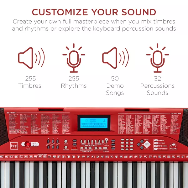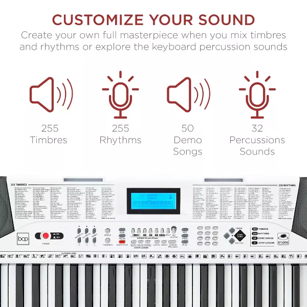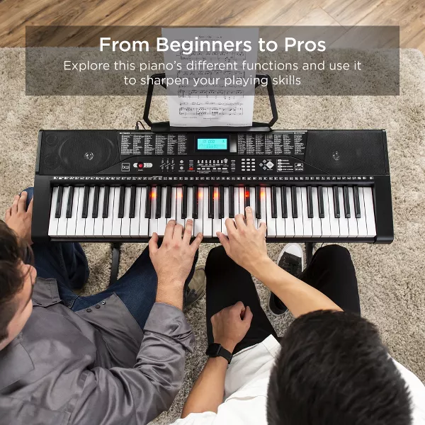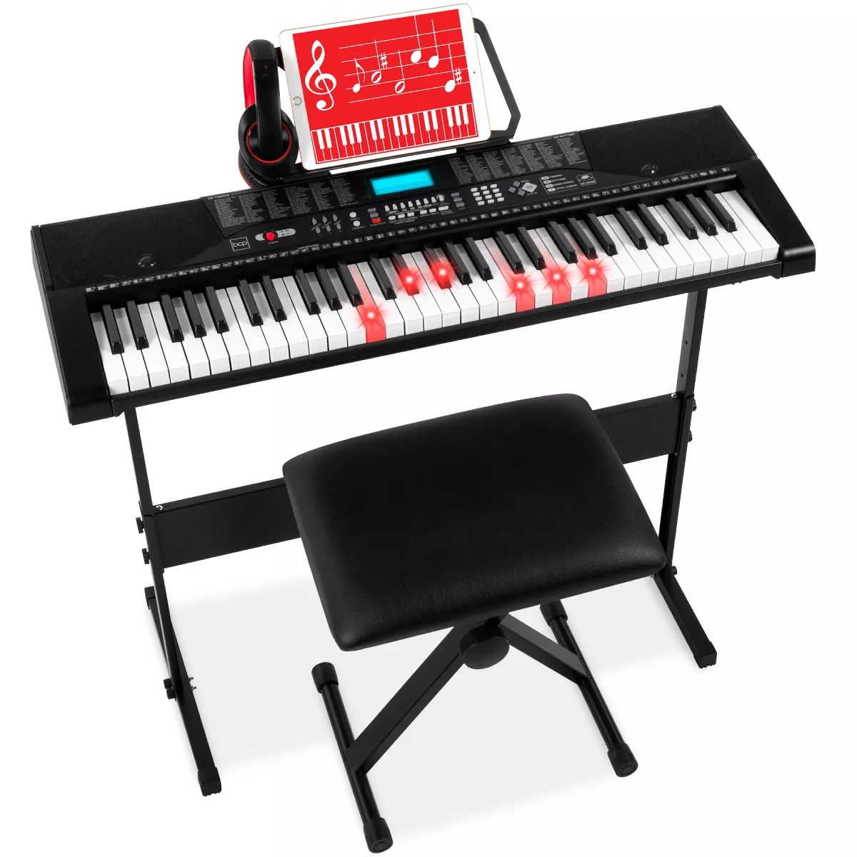 Making music has never been so easy! Learn by playing, follow along as keys light up in teaching mode, and play your way to proficiency. Create your own full masterpiece when you mix timbres and rhythms or explore the keyboard percussion sounds and in effect, customize your sound. Here's what's included: a keyboard, a music holder, a stand (15in x 32in x 22.5-27in), and a chair (12in x 16in x 19in). All of these tools are perfect for beginners, as they explore this piano's different functions and use them to sharpen their playing skills. Headphones are included, wear them to cancel surrounding distractions when you need that extra focus thanks to the padded speakers. From pros to beginners this piano is ready for you!