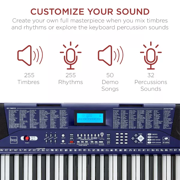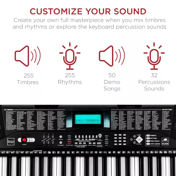 STANDARD SIZE ELECTRONIC KEYBOARD: Complete with 61 keys, 255 timbres, 255 rhythms, 50 demo songs, 32 types of keyboard percussion, and a starting tempo of 120 BPM
