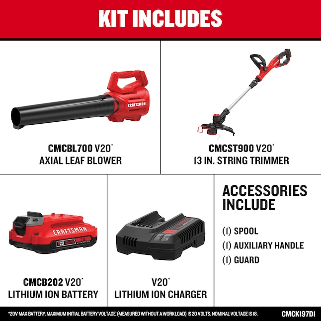 Incluye: (1) recortadora de hilo CMCST900 V20*, (1) soplador axial CMCBL700 V20*, (1) batería de iones de litio CMCB202 V20* de 2,0 Ah, (1) cargador V20*