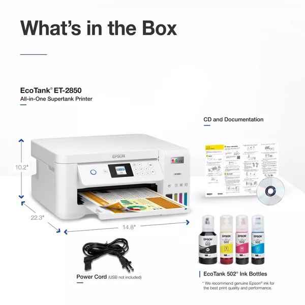 Your home needs a printer that’s fast, affordable, easy to use, and has great features. That’s why we developed the EcoTank ET-2850 – an innovative cartridge-free solution that uses high-capacity, easily refillable ink tanks. So you’ll worry less about running out of ink, and save a lot on replacement ink. The ET-2850 features outstanding print quality, auto-duplex printing, a high-resolution flatbed scanner, and convenient color display – making it the perfect family printer.