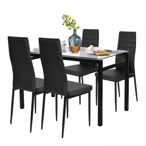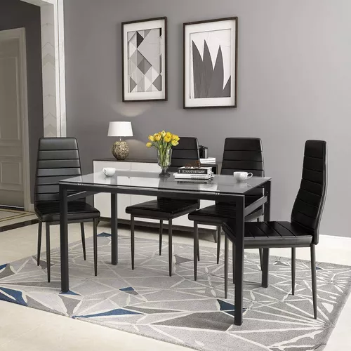 ***Disfruta de este juego de comedor de estilo moderno y minimalista que incluye 1 mesa rectangular con tapa de vidrio templado y 4 sillas de comedor en color negro.