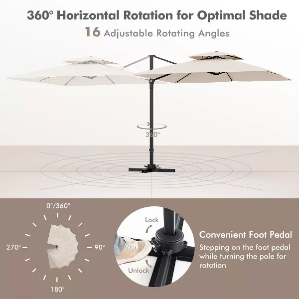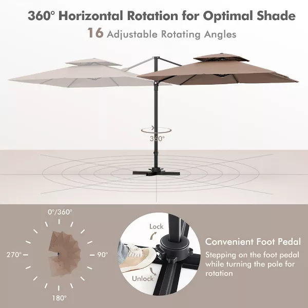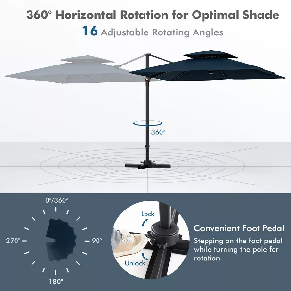 Creating a cool leisure zone with the patio cantilever umbrella! Our patio cantilever umbrella features a foot pedal with 16 gears, which is upgraded to provide 16 rotational directions for protection from the sun throughout the day. Equipped with a premium polyester fabric, it features excellent wear-resistant for lasting use. Meanwhile, it will effectively protect you from harsh sunlight and light rain. Additionally, double vented top is designed to avoid stuffy experience and improve wind-resistance. Besides, the main pole is constructed of powder-coated aluminum to resist rust and enhance stability. And there are 8 metal ribs to improve sturdiness.