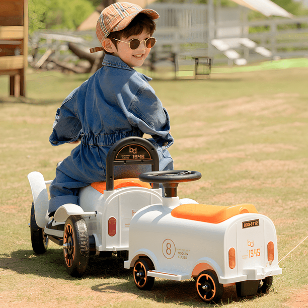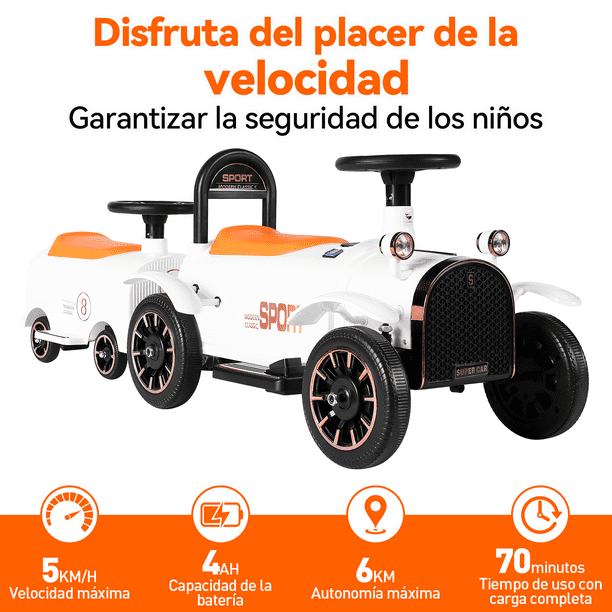 - ¡Modelo Nuevo! También Pensamos En Los Más Pequeños De La Casa Para Que La Diversión Sea En Familia Con el nuevo Tren Eléctrico Para Niños Honey Whale BDQ-8112, Con Un Desplazamiento Suave Y Fluido y Una Increíble Autonomía Y Una Sólida Estructura Con Hermosos Acabados Minimalista, Con Los Que Sin Duda Robarás Miradas A Su Paso. ---Experiencia de conducción auténtica--- El tren eléctrico de cuatro ruedas para niños se maneja fácilmente solo con el control del volante y los pedales, permitiendo que los niños experimenten la verdadera sensación de conducir y desarrollen su sentido de dirección. La velocidad máxima es de solo 5 km/h, permitiendo que los niños disfruten de la emoción de la velocidad de manera segura. ---Operación sencilla--- Cuando los niños conducen de forma independiente, el acelerador se controla con el pedal, y soltar el pedal actúa como freno, con una respuesta rápida. Presionar el botón de marcha atrás cambia al modo wika de retroceso. Además de conducir con una sola unidad, también se puede conectar un segundo compartimiento, permitiendo que los niños jueguen con amigos y fortalezcan la amistad. ---Seguridad garantizada--- El coche eléctrico para niños con diseño de neumáticos a prueba de explosiones y pinchazos aumenta la seguridad. Con baterías de plomo-ácido, una carga completa proporciona una autonomía de 70 minutos, permitiendo que los niños jueguen durante períodos prolongados. Apto para niños de 3 a 8 años, con un peso inferior a 50 kg y una altura de 0.9 a 1.3 m. ---Panel educativo multifuncional--- El panel de control ofrece funciones de educación temprana, con canciones y cuentos en inglés integrados para que los niños puedan aprender mientras juegan. El panel cuenta con un puerto USB para conectar una unidad flash y reproducir música. También muestra el nivel de carga, recordando a los niños cargar a tiempo para evitar que el vehículo quede inutilizable debido a la falta de energía. ---Regalo que acompaña el crecimiento de los niños--- El carro eléctrico montable para niños combina educación y entretenimiento, promoviendo el crecimiento feliz de los niños. Al conducir, se desarrolla el sentido de dirección y la confianza. Este vehículo eléctrico fortalece la relación entre padres e hijos y es la elección perfecta como regalo de cumpleaños o Navidad.