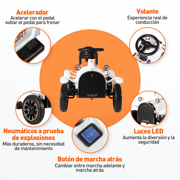 Autonomía 70 minutos Edad recomendada 3 a 8 años Velocidad máxima 5km/h Capacidad máxima 50 kg