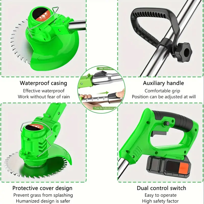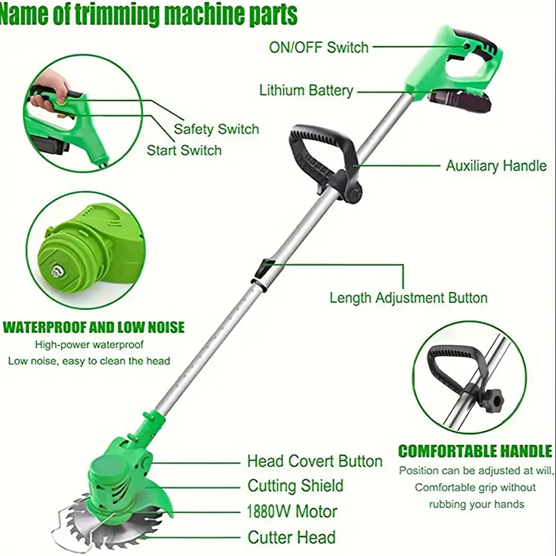 Por favor, carga completamente la batería antes de usar por primera vez la recortadora de maleza. Presta atención a la seguridad al utilizar la máquina cortadora, mantente alejado de las personas cuando la recortadora de maleza esté funcionando para evitar ser herido por la cuchilla.