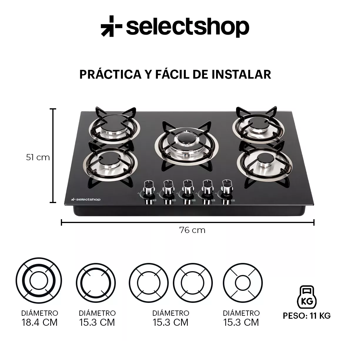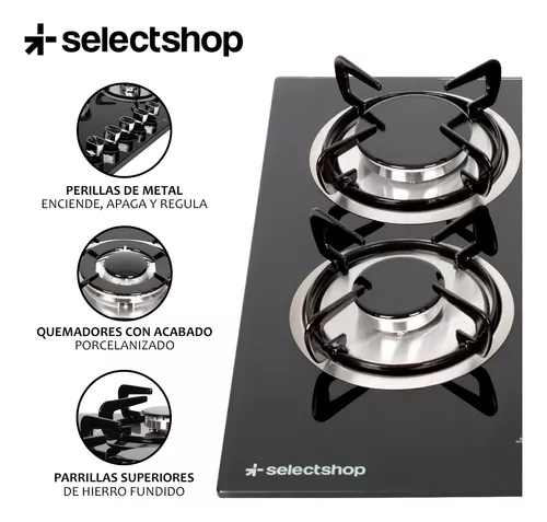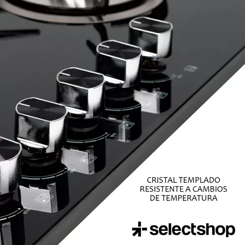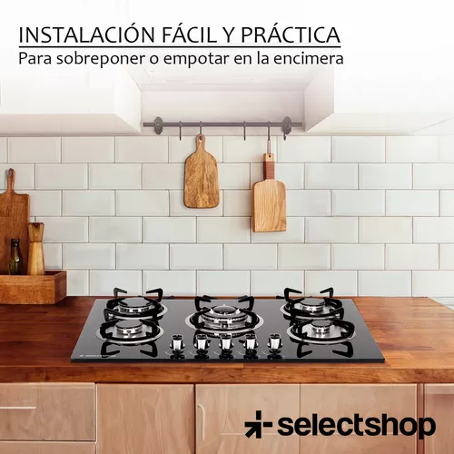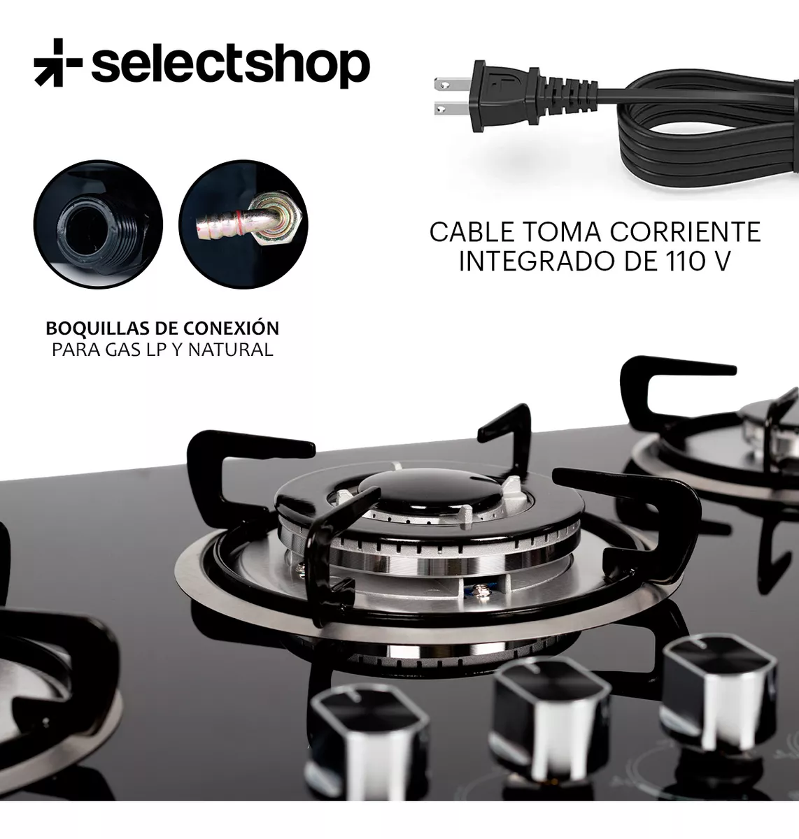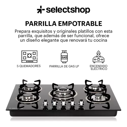 - La parrilla a gas de Selectshop es lo que esperas para tu cocina, ya que cuenta con 5 quemadores de acero inoxidable, perillas de control, encendido eléctrico con cable toma corriente integrado, y lo mejor es que puedes empotrarla o sobreponerla sobre la encimera.