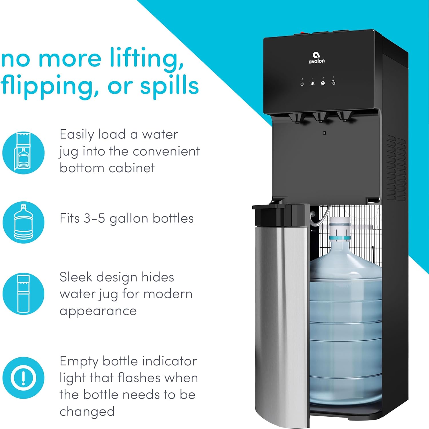 CARGA INFERIOR CON BIOGUARD: Nuestro enfriador de agua se carga desde abajo para eliminar la tensión de levantarlo, reducir los derrames y es adecuado para botellas de agua de 3 a 5 galones (BOTELLA NO INCLUIDA). Las áreas de alto contacto también se tratan con un recubrimiento antimicrobiano BioGuard para evitar el crecimiento de bacterias.
