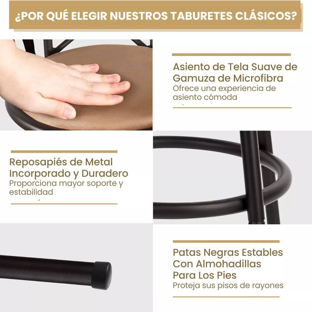 Fácil de montar y mantener: Proporcionamos manuales de instrucciones claros para ayudarlo a instalar el taburete fácilmente. Todo el hardware está incluido en el paquete. Además, no se preocupe demasiado por ensuciar este taburete de bar. El asiento tapizado es fácil de limpiar con un paño húmedo.