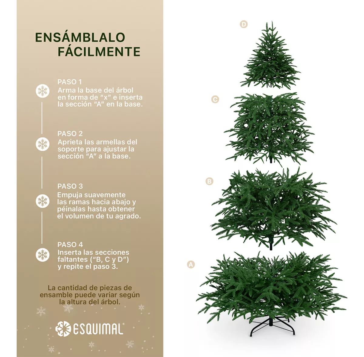 ARMAR TU ÁRBOL ES MUY SENCILLO: Comienza por desplegar en forma de “X” la base metálica (con las armellas incluidas). Ensambla las secciones de tu árbol; las ramas se desplegarán gracias a su SISTEMA DE ARMADO AUTOMÁTICO, cayendo de manera sencilla y rápida con la fuerza de la gravedad. Luego, acomoda las ramas para agregar volumen a tu árbol y, finalmente, decóralo como más te guste.