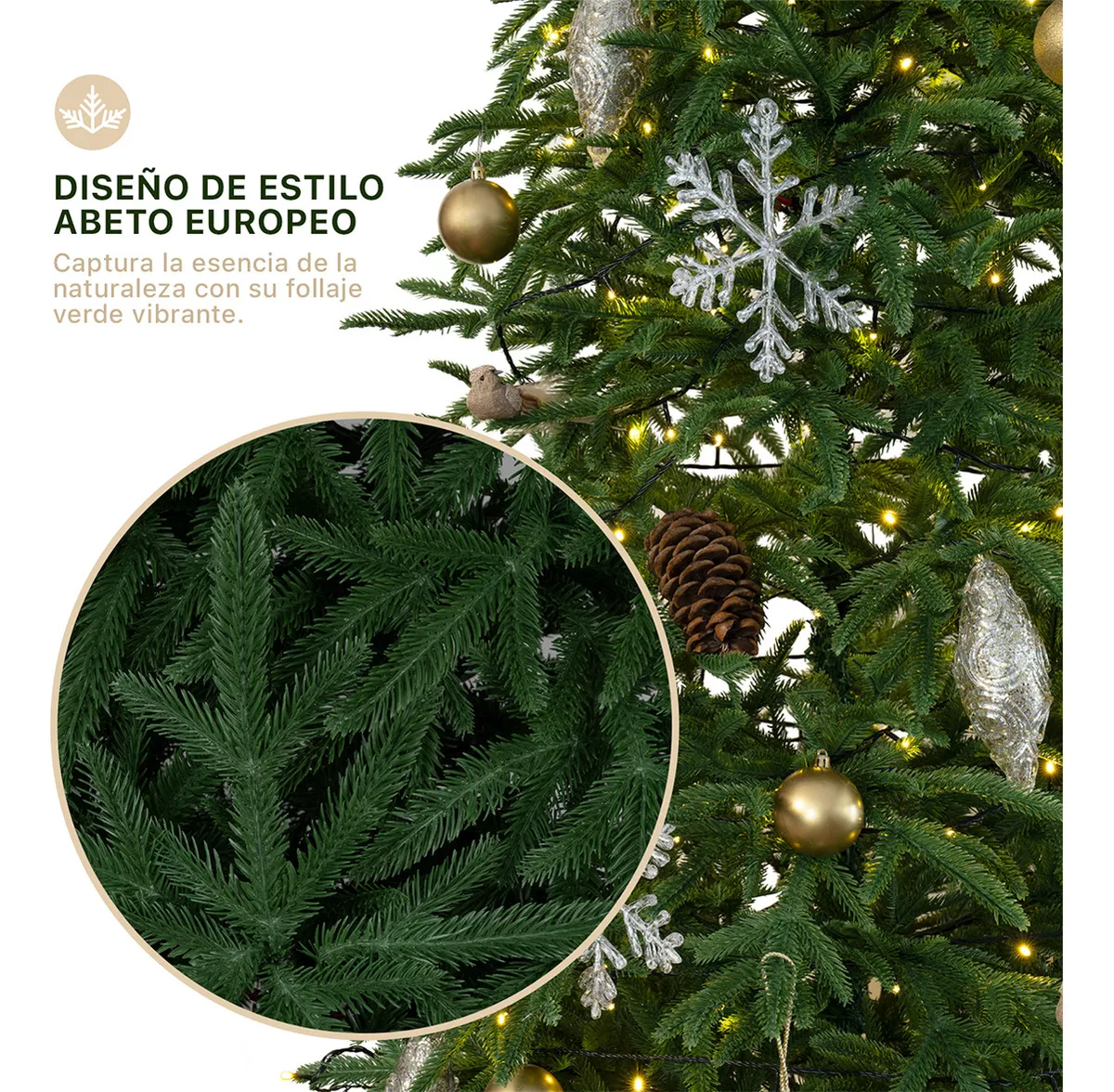 ACABADO NATURAL: Nuestros árboles están cuidadosamente diseñados para lucir naturales; sus ramas y colores son de textura realistas, inspirados en la naturaleza del pino canadiense, el cedro del himalaya y el abeto europeo que brindan un aspecto frondoso y fresco, ideales para tu decoración navideña.