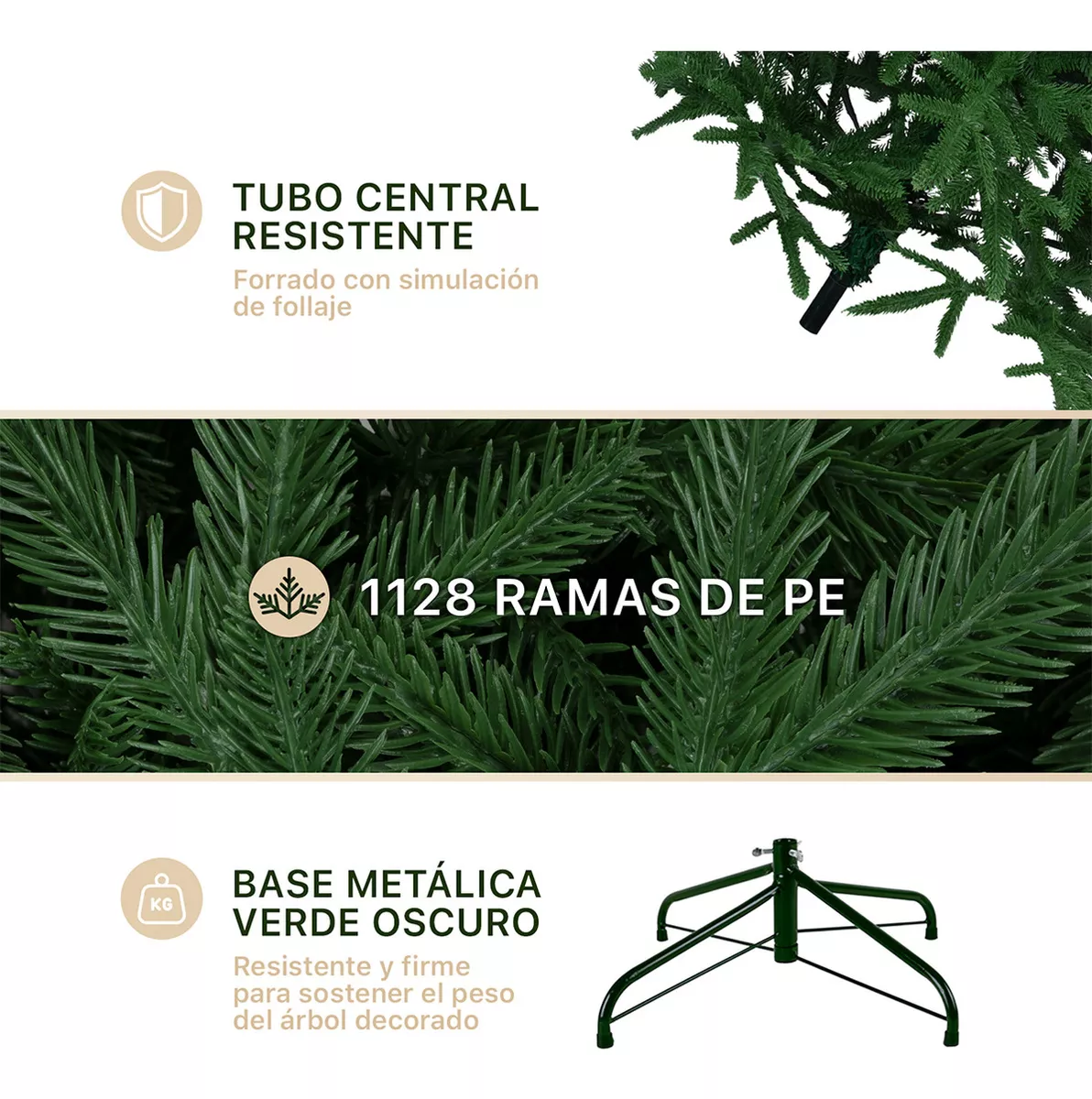 ESTABILIDAD Y RESISTENCIA: Cada sección del árbol se une por un tubo central metálico de alta resistencia que lo mantiene firme. Además, cuenta con una base metálica de cuatro patas que proporciona la mejor estabilidad, por lo que no tendrás que preocuparte por las bases de plástico que se rompen fácilmente.