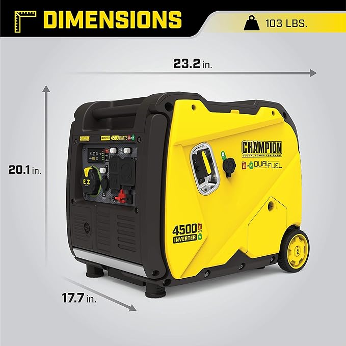 El generador inversor portátil Champion Power Equipment 200988 de 4500 vatios es la combinación perfecta de versatilidad y comodidad, ya sea que necesites energía para tu hogar, RV o proyecto. El práctico arranque eléctrico incluye una batería, además de la tecnología Cold Start garantiza un arranque rápido en climas fríos. Conecta tus dispositivos electrónicos sensibles con confianza, ya que este inversor solo produce energía limpia (3% THD). Diseñado para la seguridad con un sensor de apagado de aceite bajo, este inversor tiene una capacidad de aceite de 0.6 cuartos (botella de aceite 10W-30 incluida). Opera tu generador de combustible dual directamente fuera de la caja con gasolina o propano, y cambia fácilmente los combustibles con un giro rápido del dial selector de combustible. Usando gasolina, el motor Champion de 212 cc produce 4500 vatios de arranque y 3500 vatios de funcionamiento, y funcionará durante 14 horas con un 25% de carga. Produce 4500 vatios de arranque y 3150 vatios de funcionamiento, y funcionará durante 21 horas con una carga del 25% cuando se utiliza un tanque de propano de 20 libras. La tecnología inversor de Champion incluye el modo de economía inteligente, que puede reducir la carga eléctrica, proporcionando un funcionamiento más silencioso, mayor vida útil del motor y una mejor economía de combustible. Se incluyen una RV de 120 V 30 A (TT-30R), dos tomas domésticas de 120 V 20 A (5-20R), una toma de estilo automotriz de 12 V CC con adaptador USB doble, además de una manguera de propano con un regulador integrado. Funciona a 61 dBA desde 25 pies, aproximadamente el mismo nivel de ruido que la conversación normal. El kit paralelo opcional proporciona una conexión rápida con clip que te permite aumentar la salida conectando hasta dos inversores de 3000 vatios o superiores, e incluye una toma de corriente estándar de RV de 50 amperios con potencia para arrancar y ejecutar dos aires acondicionados de RV de 15.000 BTU. Totalmente montado con mango plegable para un fácil almacenamiento y asas integradas y neumáticos nunca planos para un fácil transporte. Compra este inversor certificado por EPA y compatible con CARB con confianza: Champion Support y nuestra red nacional de centros de servicio respaldarán tu compra con una garantía limitada de 3 años y soporte técnico gratuito de por vida