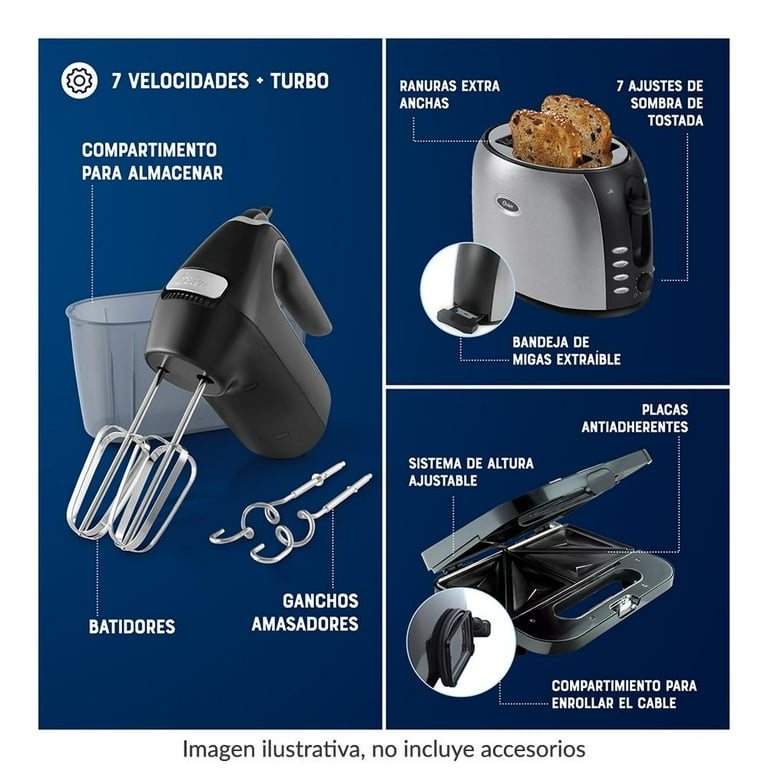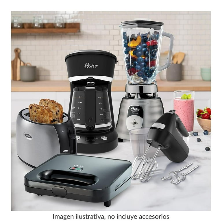 1 Licuadora clásica Oster, 1 cafetera programable 12 tazas, 1 batidora de mano, 1 tostador 2 rebanas , 1 sandwichera