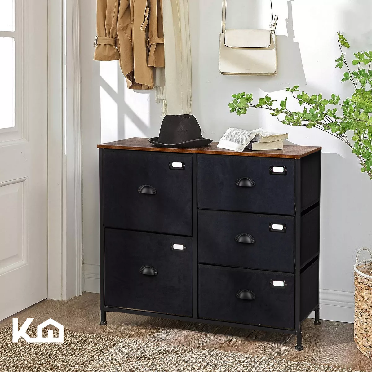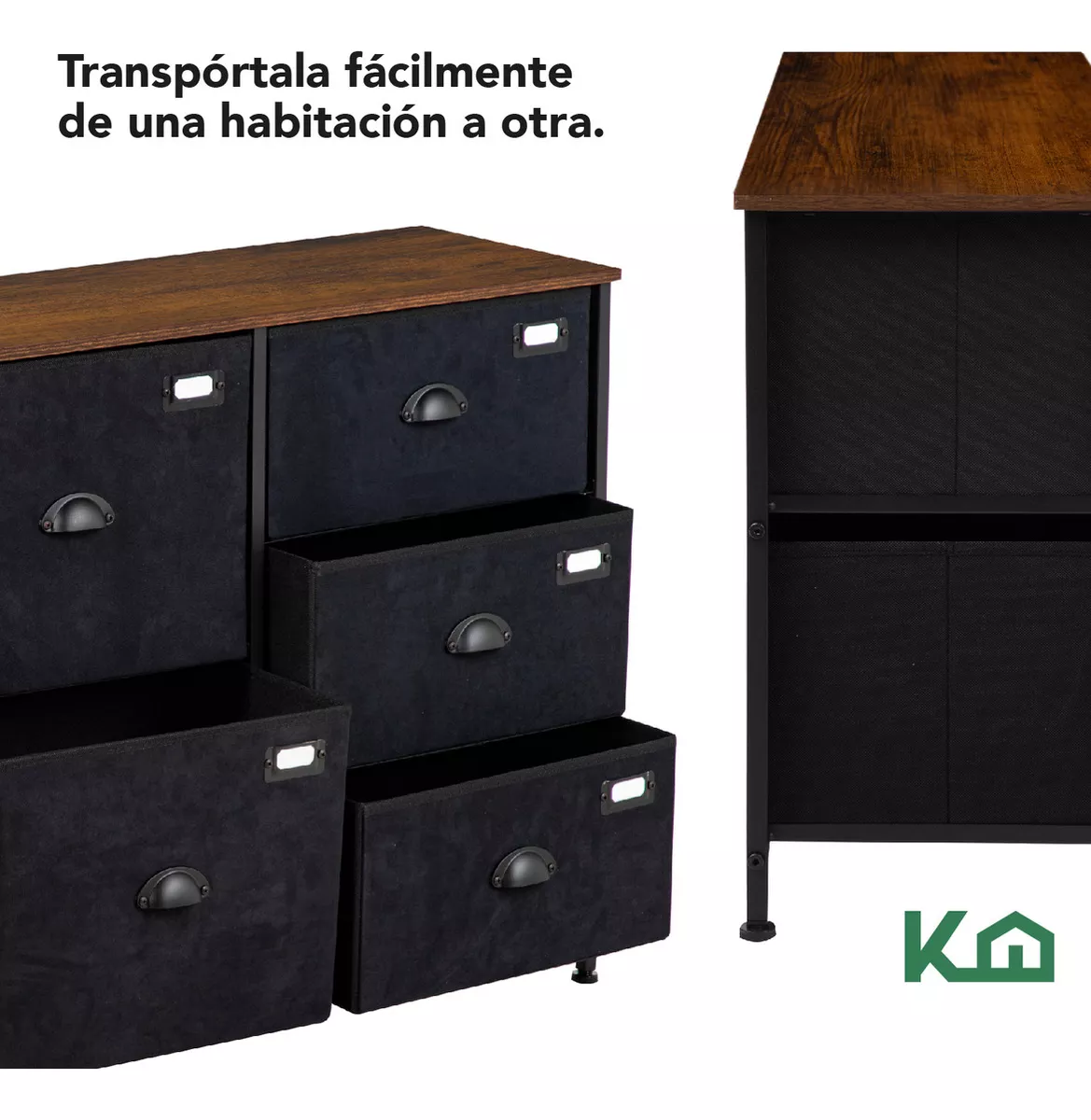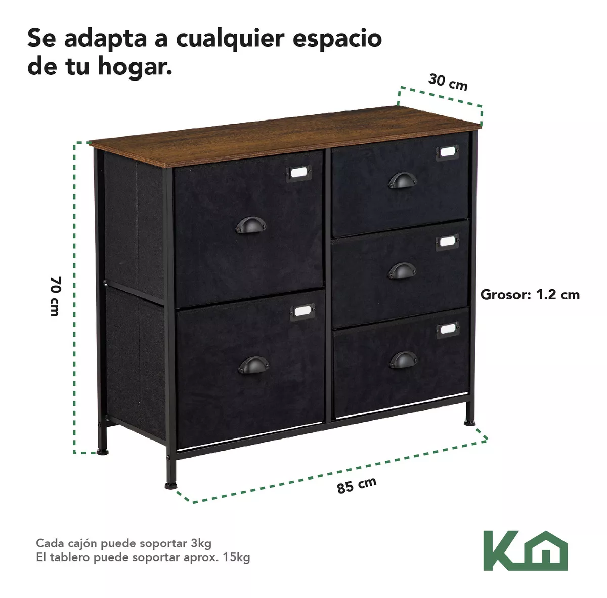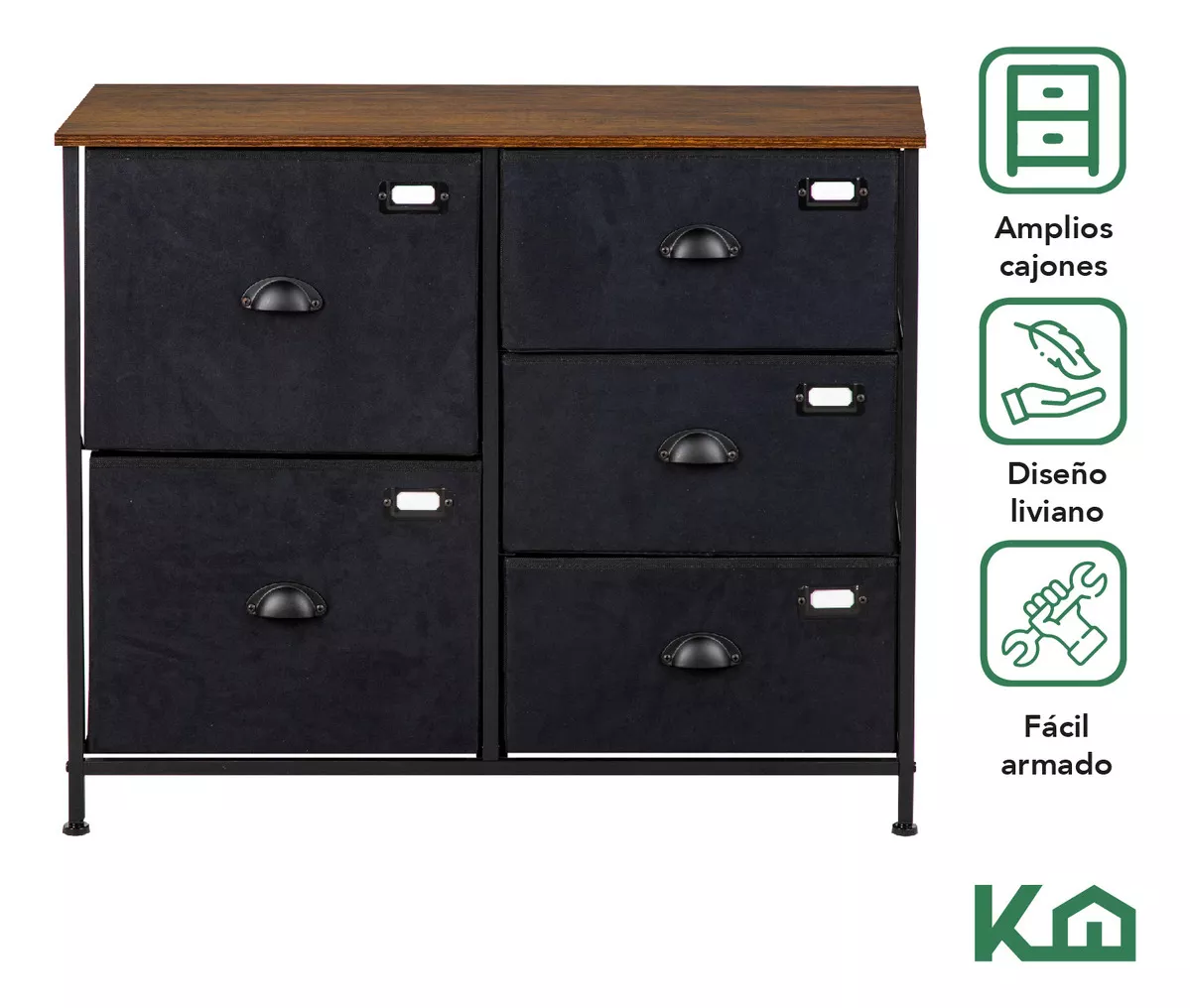 Comoda Cajonera 5 Cajones Mueble Organizador De Tela Madera Acabado Mate Color Negro Kingshouse