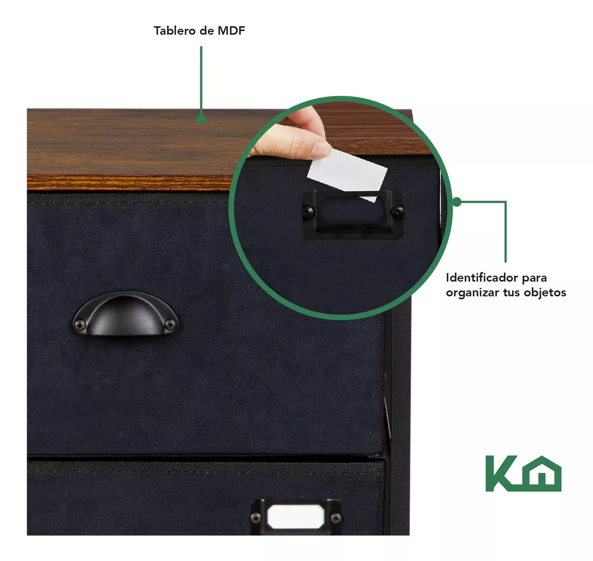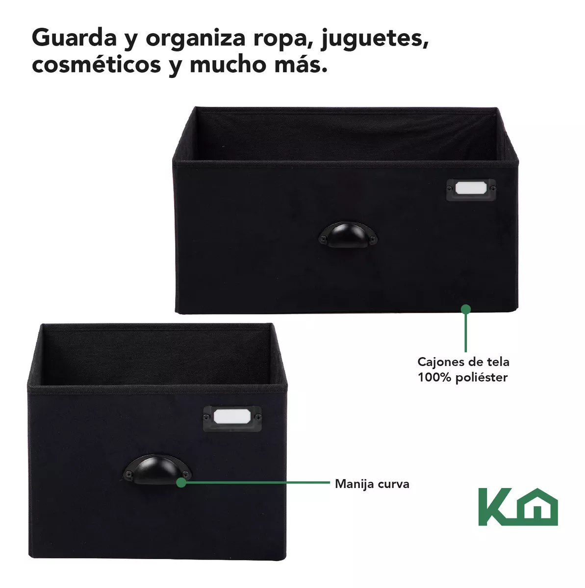 - Cajones de tela con identificadores para organizar objetos. Medidas de los cajones de lado izquierdo (LAxANxAL): 39x28x29 cm. Medidas de los cajones de lado derecho (LAxANxAL): 39x28x20 cm.