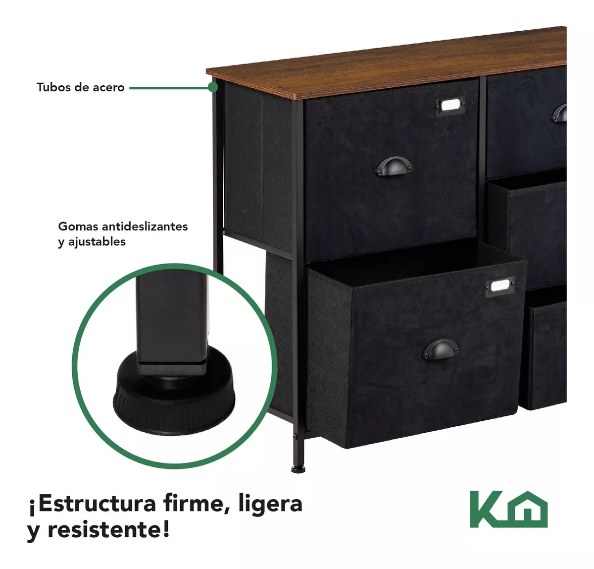 Este mueble organizador está hecho con cajones de tela 100 por ciento poliéster, son fáciles de abrir y cerrar gracias a sus manijas curvas. Su estructura es firme y estable, ya que está conformada por un tablero de madera MDF y tubos de acero con gomas antideslizantes ajustables que no rayarán tus pisos. Además, su diseño elegante embellecerá cualquier espacio.
