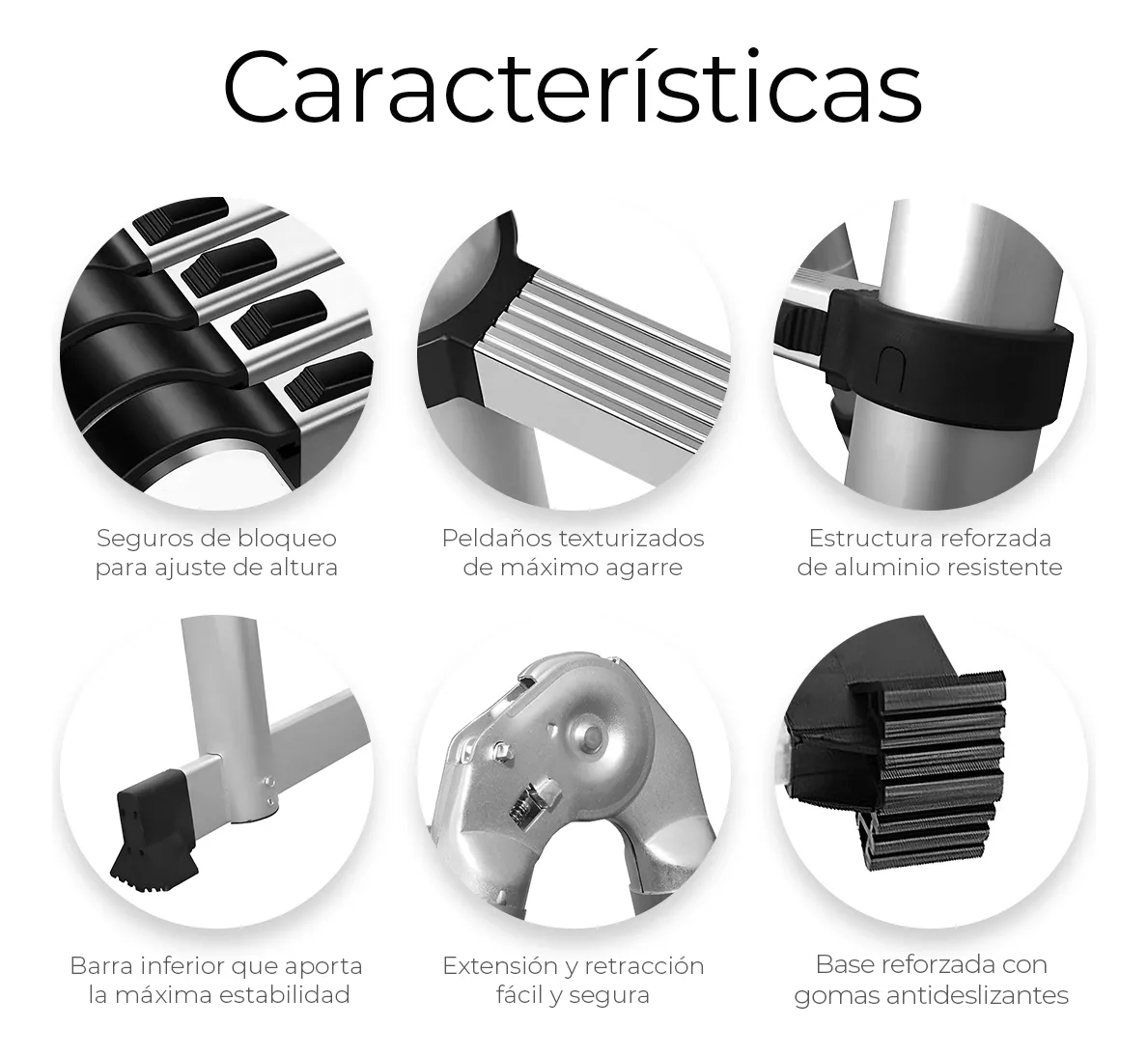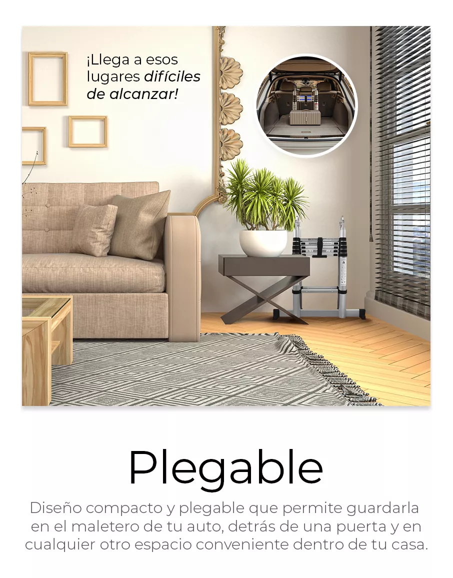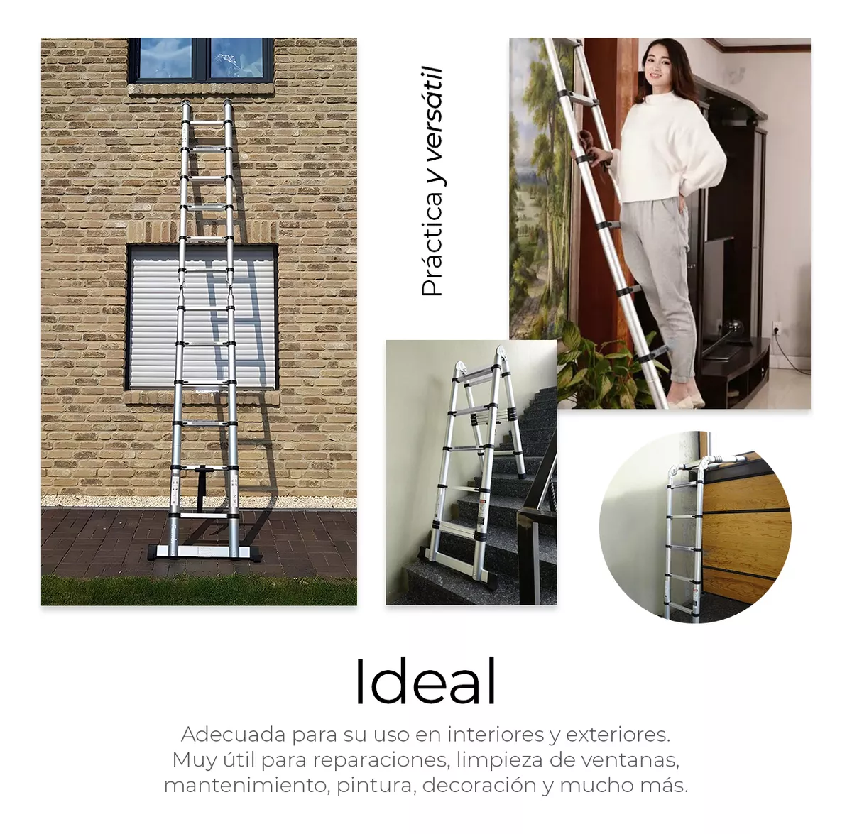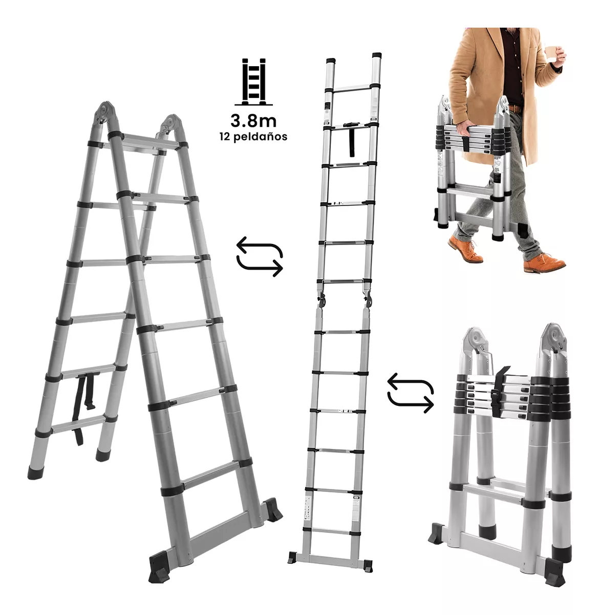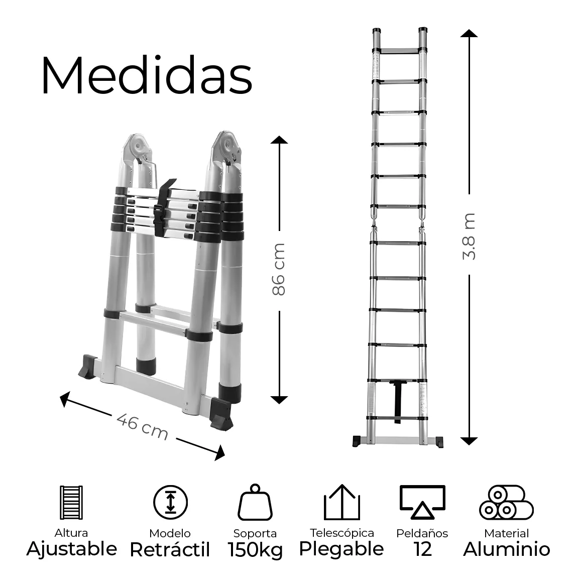 Con una altura máxima de 380 cm y 12 peldaños, podrás alcanzar cualquier lugar con facilidad y seguridad. Su diseño extensible, plegable y telescópico la hace versátil y fácil de transportar.