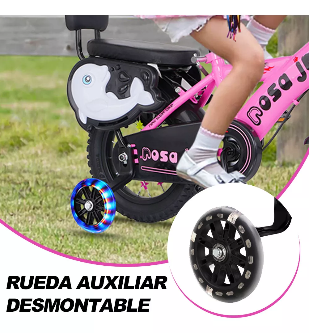Ruedas de entrenamiento: Equipadas con ruedas de entrenamiento desmontables, especialmente diseñadas para que los niños aprendan a andar en bicicleta. Estas rueditas ayudan a mantener el equilibrio y pueden quitarse fácilmente conforme mejoran sus habilidades.