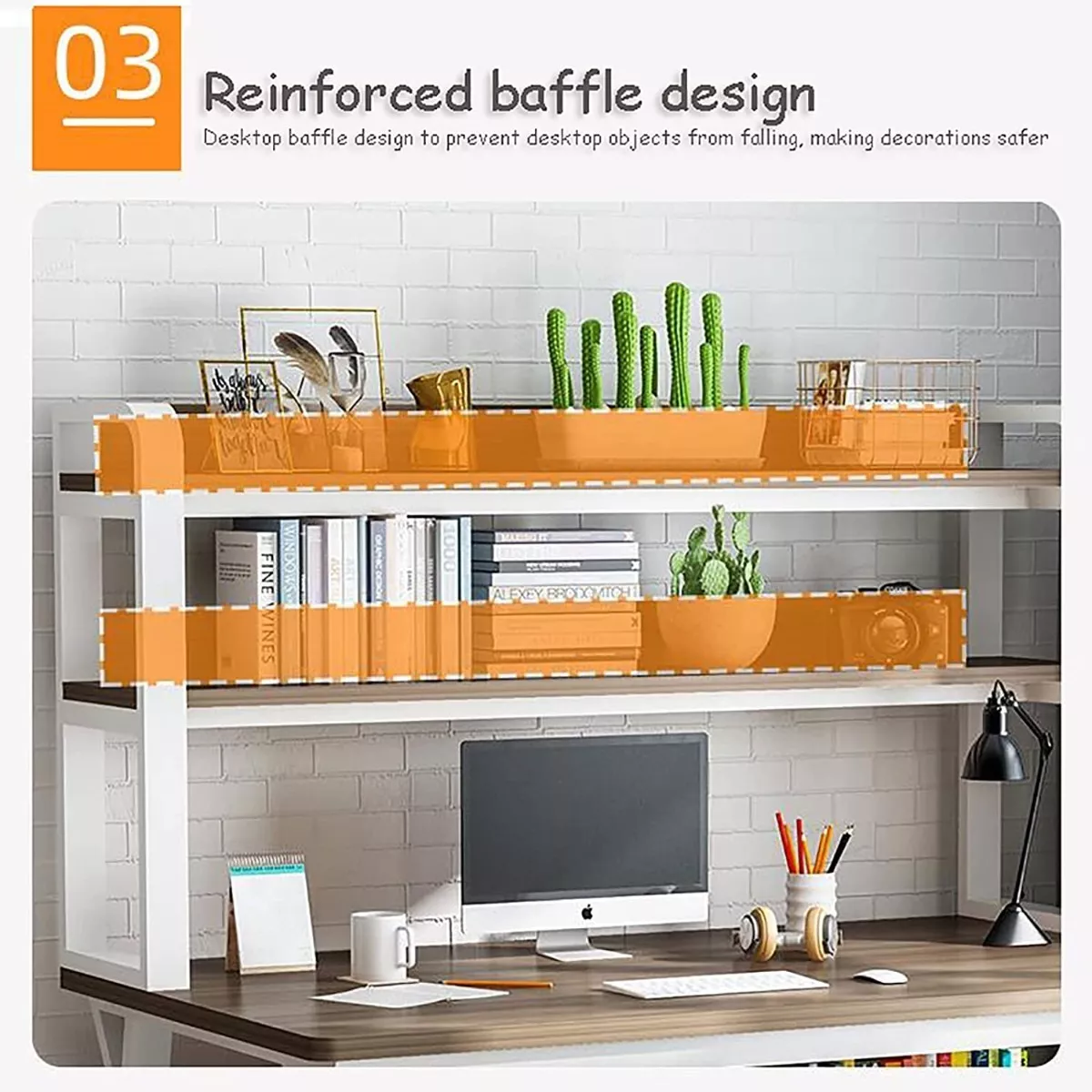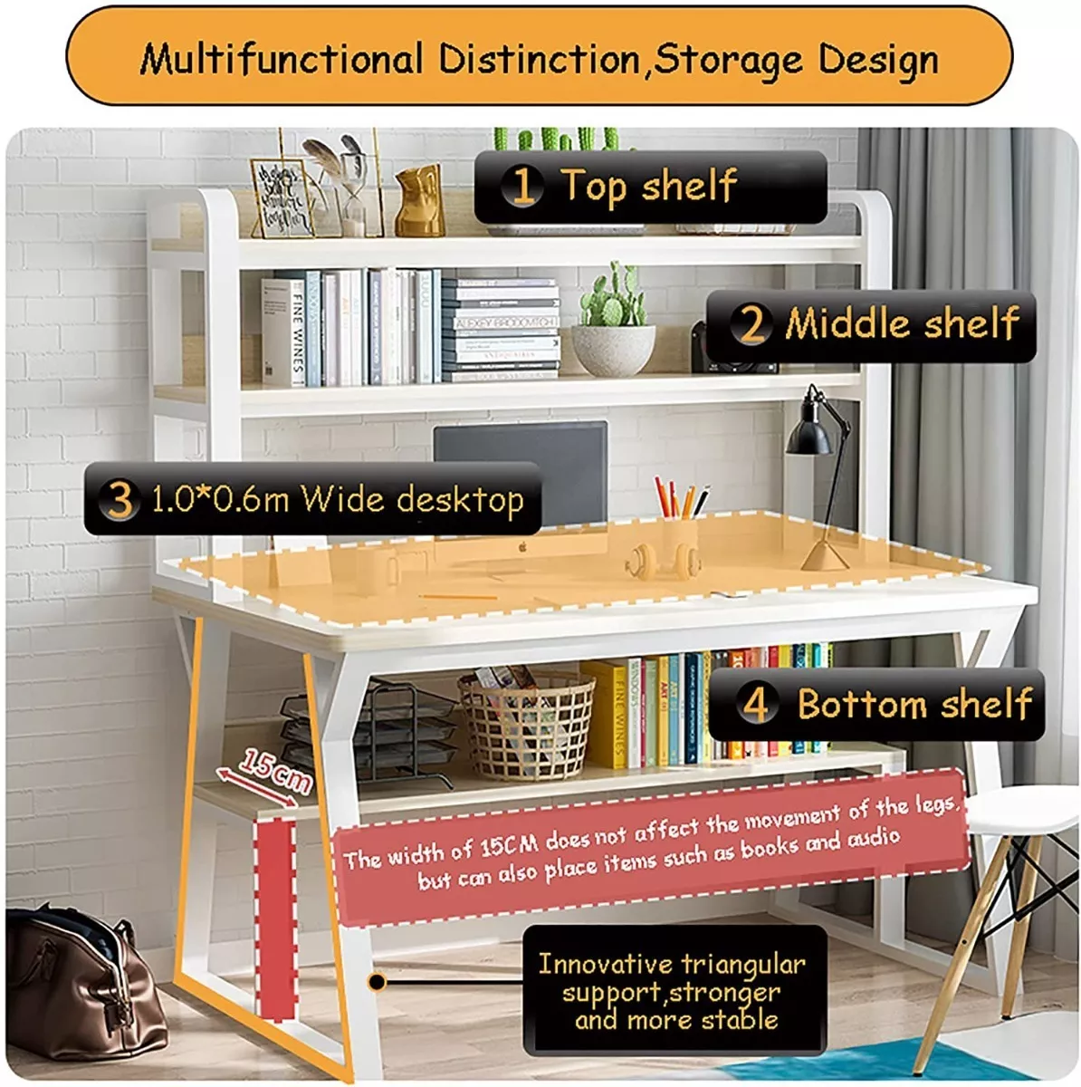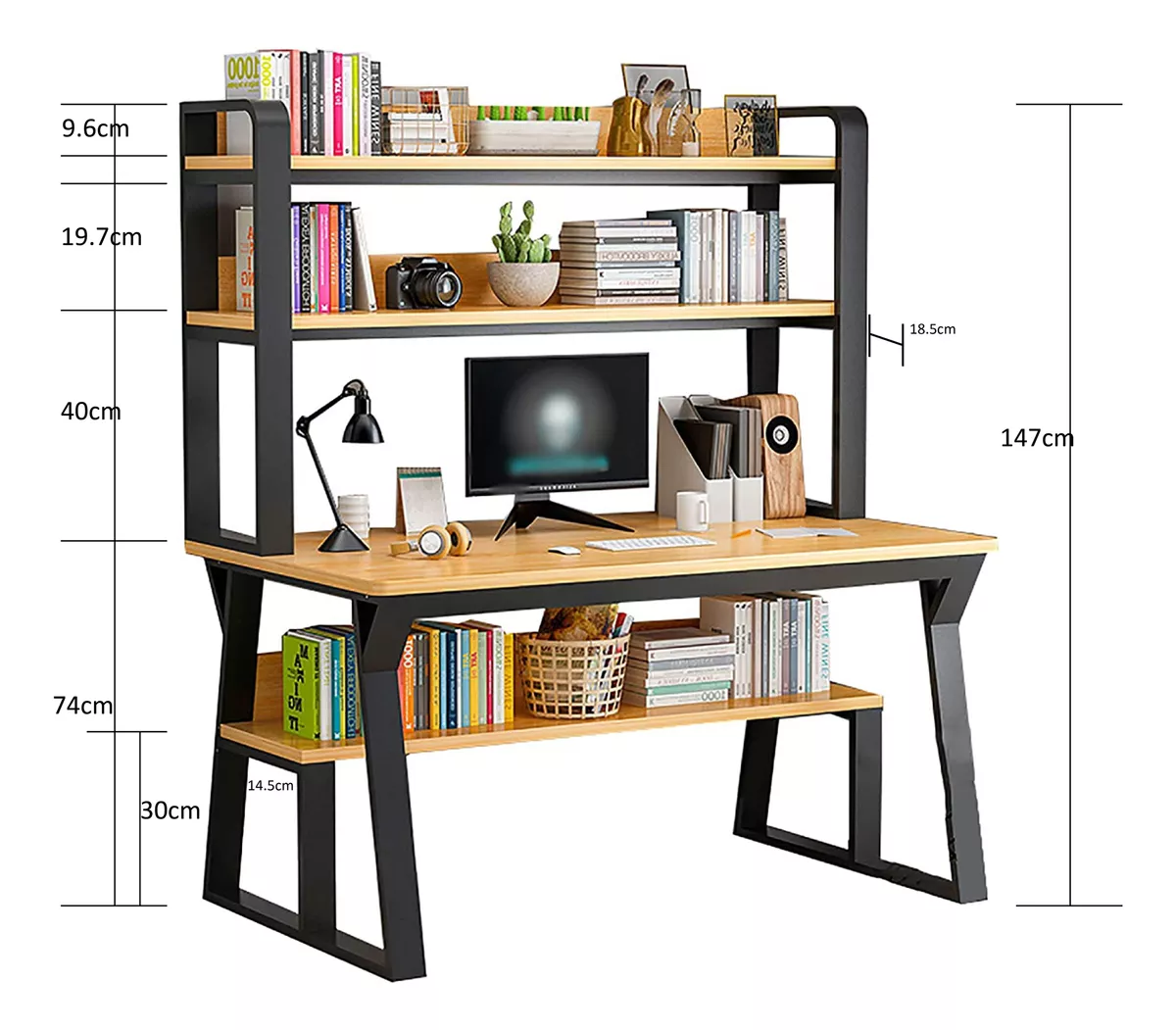 1. Estante de almacenamiento de dos capas: El estante abierto encima de la mesa proporciona espacio de almacenamiento para sus libros, documentos de oficina, etc.