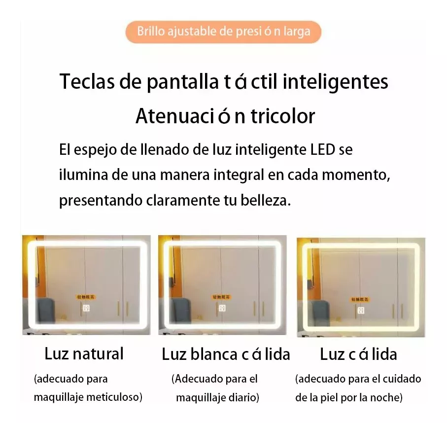 2.ILUMINACIÓN AJUSTABLE: El espejo de vanidad está equipado con tiras de luz LED ajustables y toque tres modos de luz, puede elegir diferentes simulaciones de luz de acuerdo a sus necesidades y lograr fácilmente varios diseños de maquillaje. La función de pulsación larga también puede ajustar el brillo, asegurándose de obtener el efecto de iluminación ideal en cualquier entorno etc.