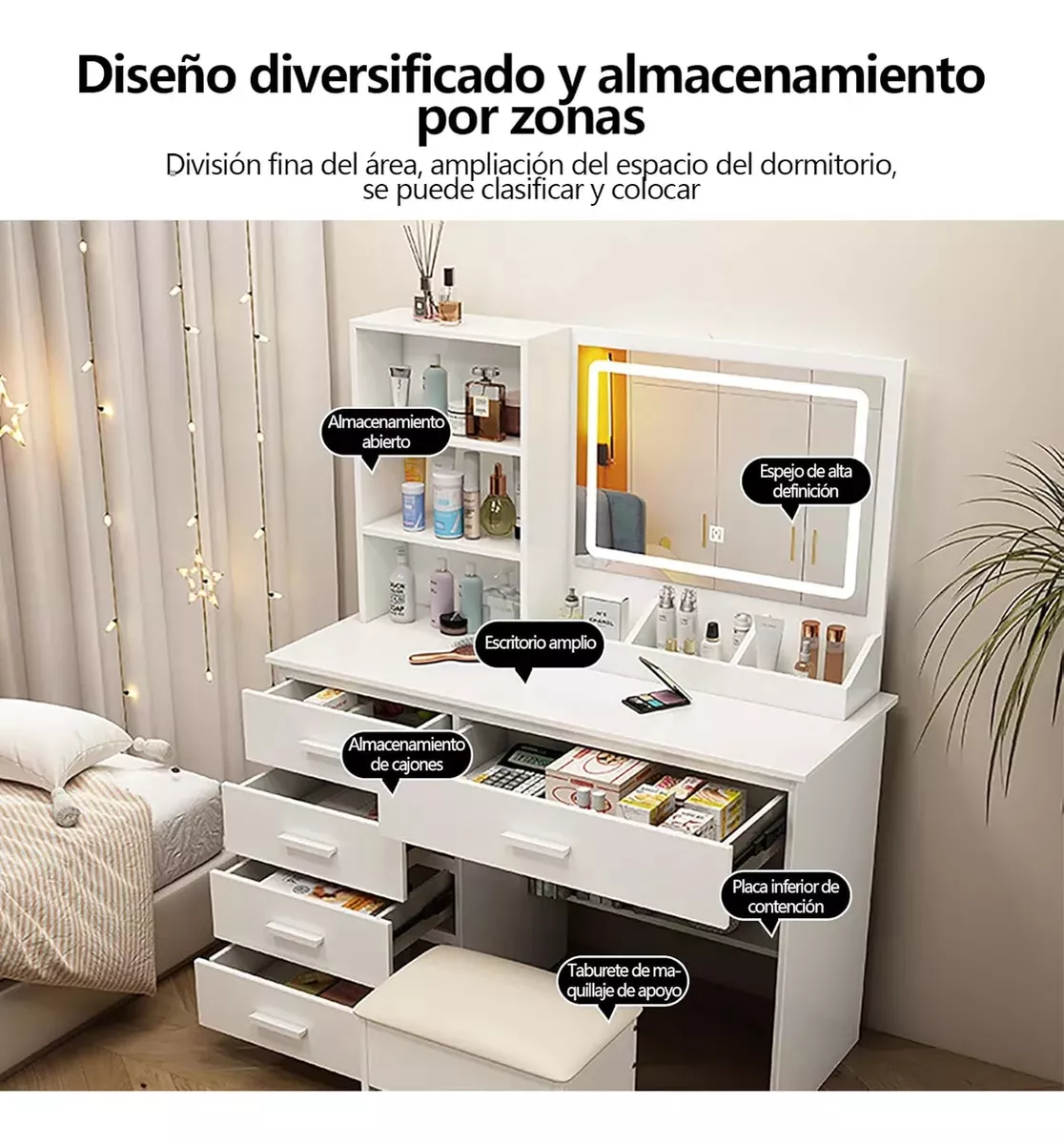 Contiene: 4 cajones, 1 taburete, 3 luces LED