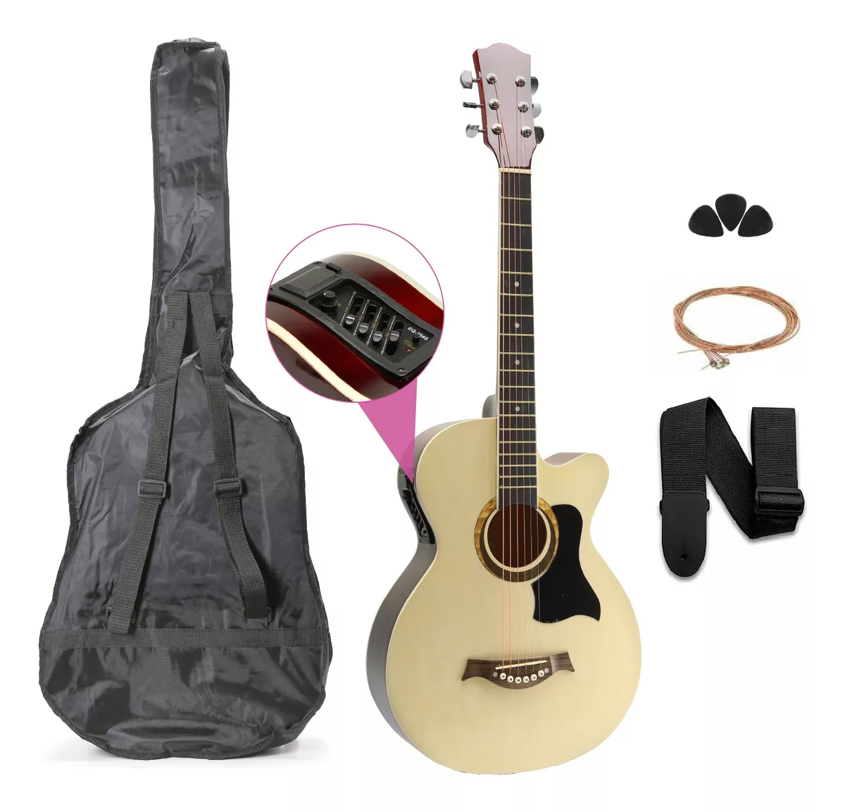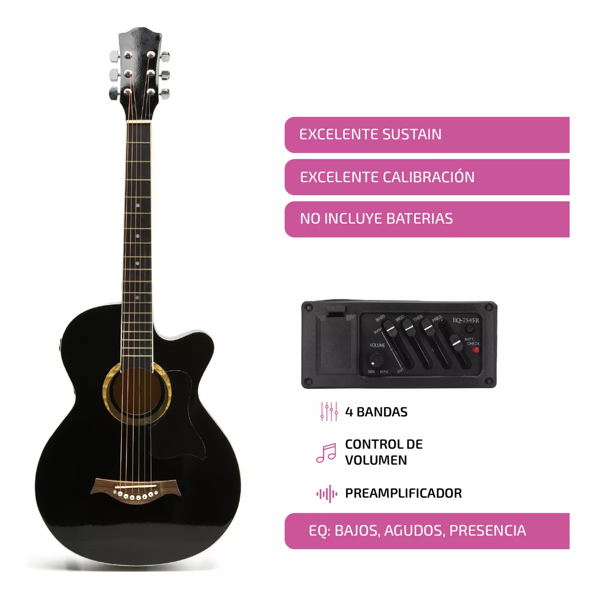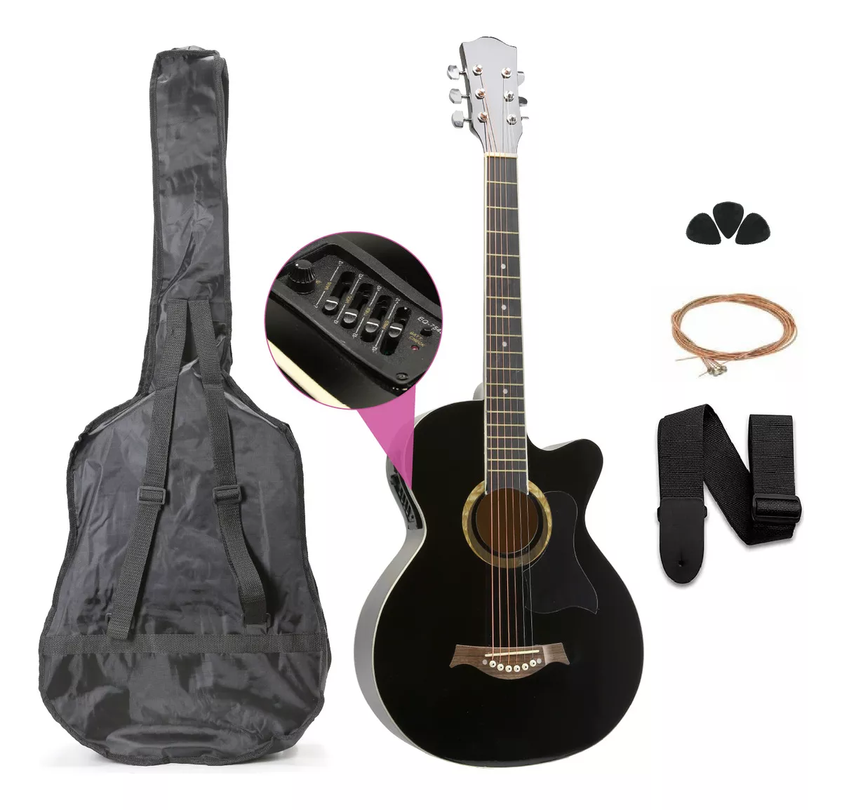 Guitarra eléctrica acústica de 38" con diapasón de arce negro con ecualizador y accesorios.