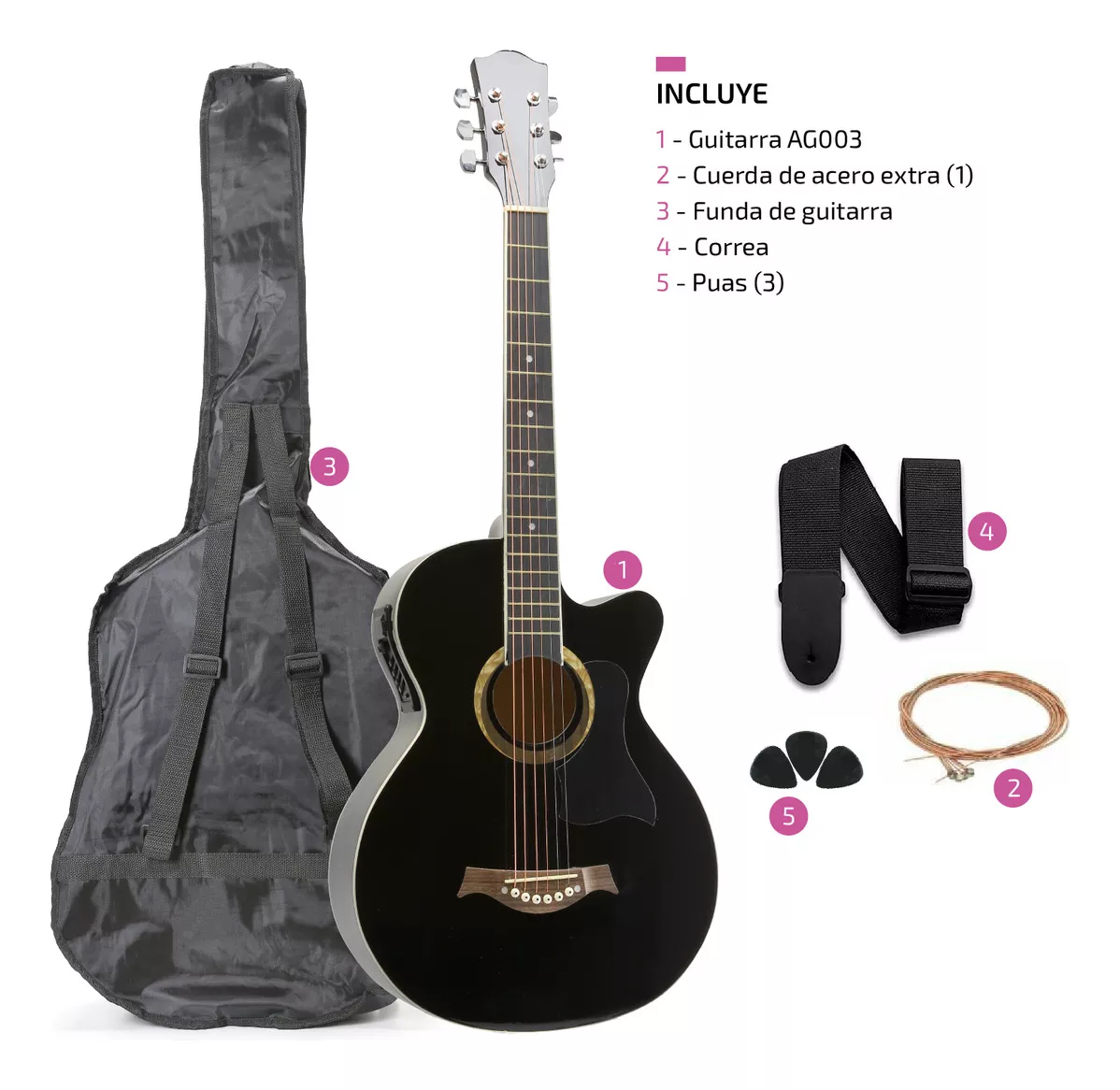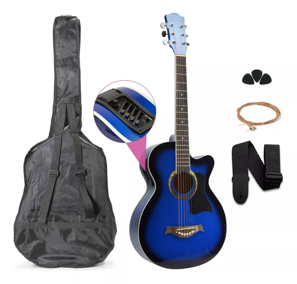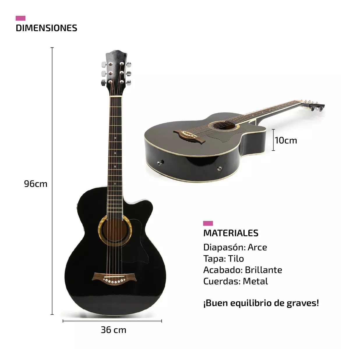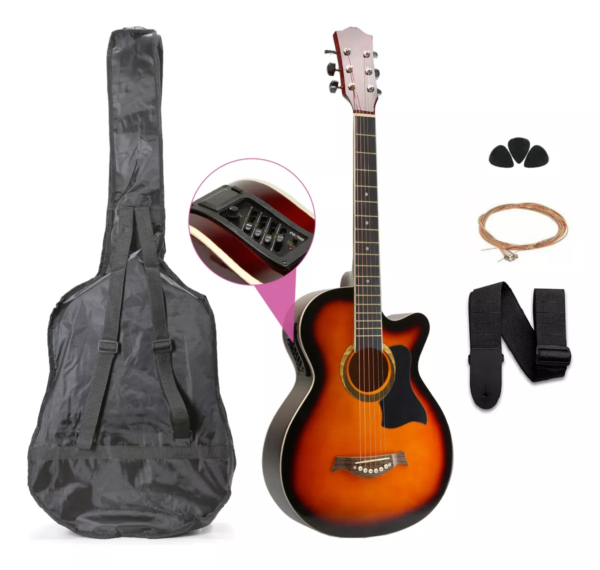Guitarra eléctrica acústica de 38" con diapasón de arce negro con ecualizador y accesorios.