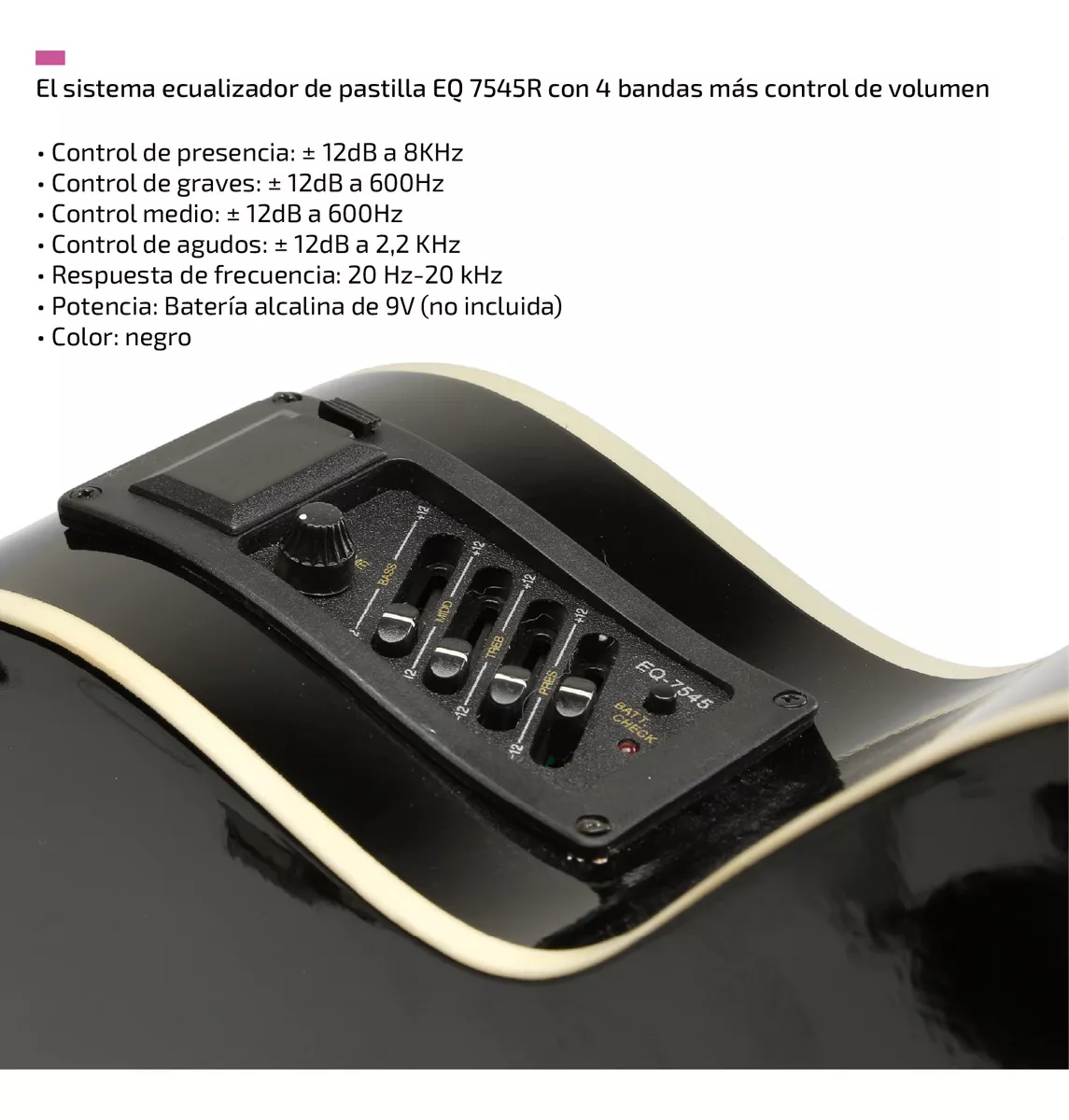 Nuestras cuerdas de acero son duraderas y resistentes a la corrosión, garantizando un sonido claro y brillante a lo largo del tiempo. Además, el sistema de pastillas con ecualizador de 4 bandas permite una personalización precisa del tono, adaptándose a las necesidades de cada músico.