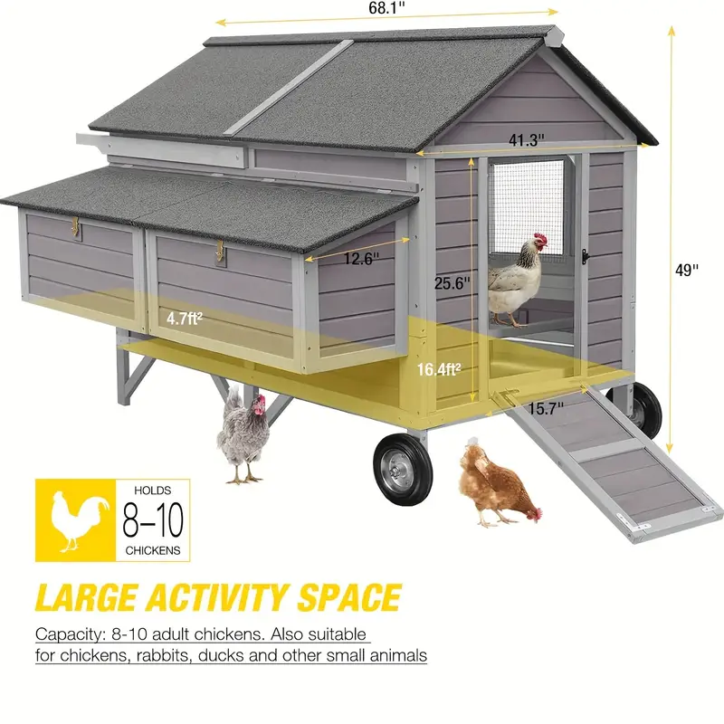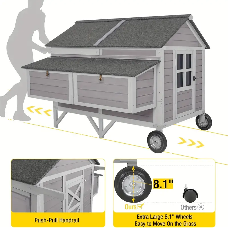 Movilidad mejorada: Equipado con ruedas de gran tamaño, este gallinero se destaca del resto. Las ruedas grandes, más grandes que otras en el mercado, hacen que la reubicación sea muy sencilla. Mueva fácilmente su gallinero a través de varios terrenos con una facilidad incomparable.