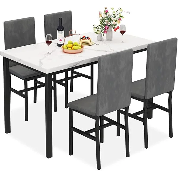 Juego de mesa de comedor para 4 personas, juego de mesa de comedor de 5 piezas de mármol con 4 sillas con marco de metal de terciopelo
