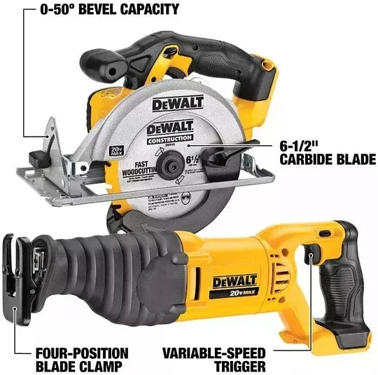| Componentes incluidos | 1) Taladro atornillador DCD780 20v MAX* 1/2", 1) Sierra alternativa DCS381 20v MAX*, 1) Atornillador de impacto DCF885 20v MAX* 1/4", 1) Luz de trabajo LED DCL040 20v MAX*, 1) DCS393 20v MAX * Sierra circular, 1) Altavoz Bluetooth DCR006, 2) Paquetes de baterías de iones de litio de 2,0 Ah de 20v MAX*, 1) Cargador, 1) Bolsa de contratista. |