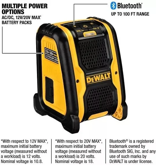 - El altavoz Bluetooth para el lugar de trabajo DCR006 funciona con CA/CC y funciona con paquetes de baterías DEWALT de 12 V y 20 V MAX*.