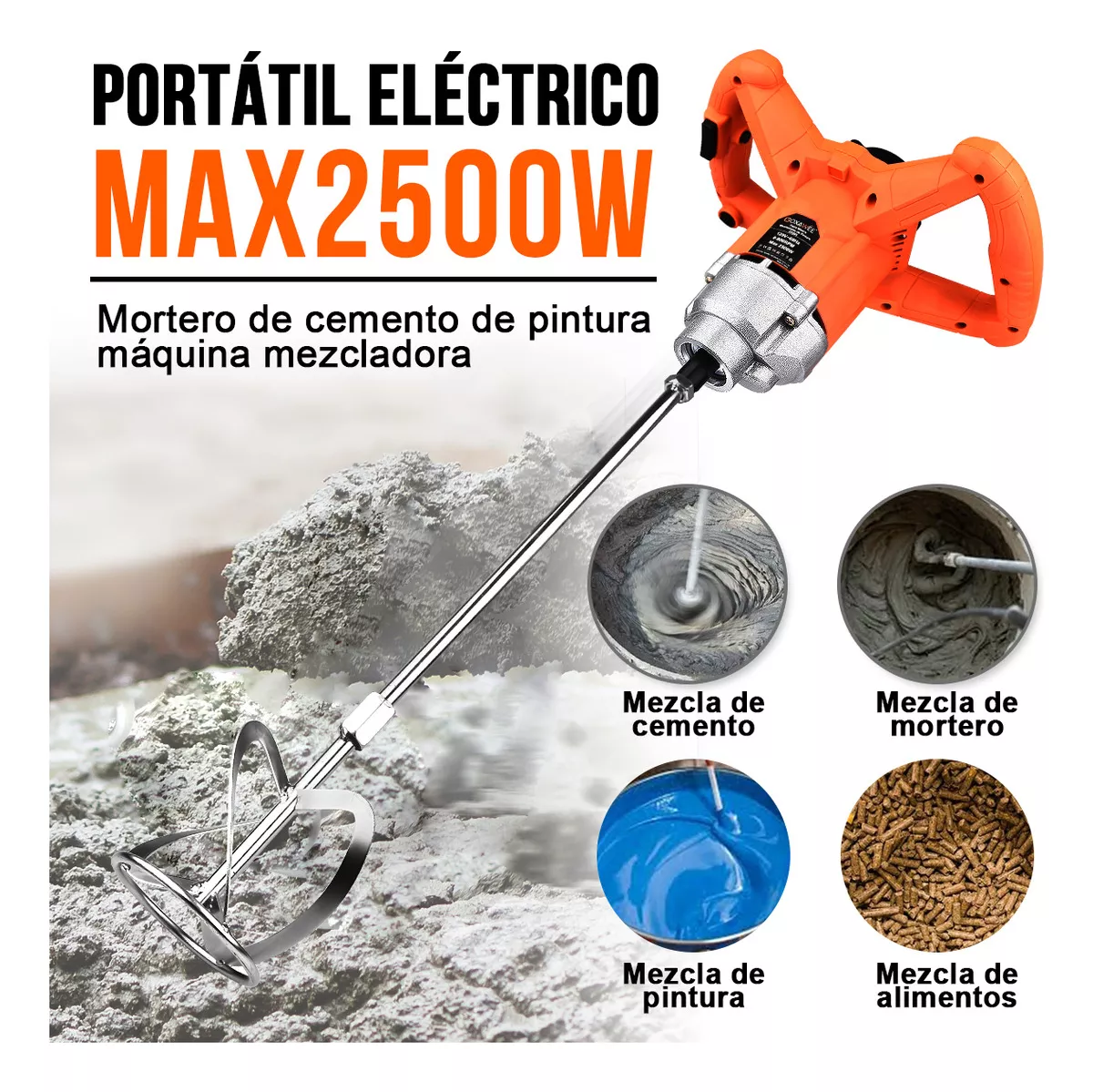 - Mezcladora de concreto 2500w: ideal para mezclar pinturas, cemento, piensos, resinas, tintas, morteros delgados, yeso, adhesivos de cemento,Y otros líquidos de viscosidad media. Nota: este producto no es adecuado para mezclas muy pegajosas de hormigón y cemento, rocas bastante grandes.