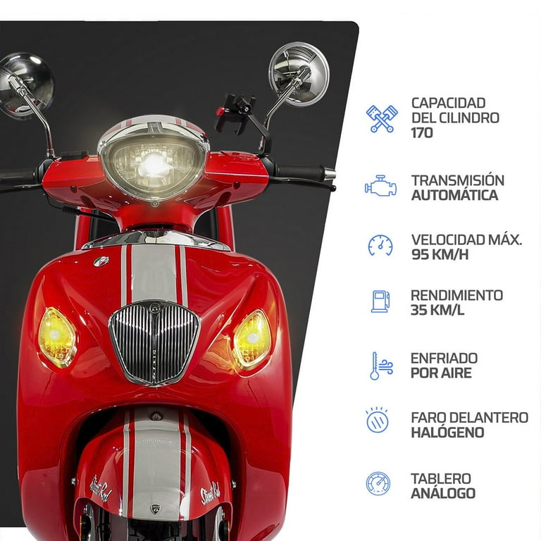 - Entra en un mundo de estilo con la motocicleta Vento modelo Streetrod 170 2025. Su transmisión automática te brinda una experiencia de conducción sin igual, mientras que su refinada personalidad se destaca con el faro frontal cromado y sus franjas deportivas, recordándonos que lo clásico nunca pasa de moda. Su xfreno de disco delantero te brinda un frenado preciso, generando mayor seguridad en cada trayecto, cuenta con una velocidad máxima de 95 Km/H y su motor 170 impulsado por 10 HP, convertirá cada recorrido en un viaje de encanto. No importa cuánto quieras llevar contigo, esta motocicleta cuenta con una amplia cajuela de carga para llevar tus pertenencias.