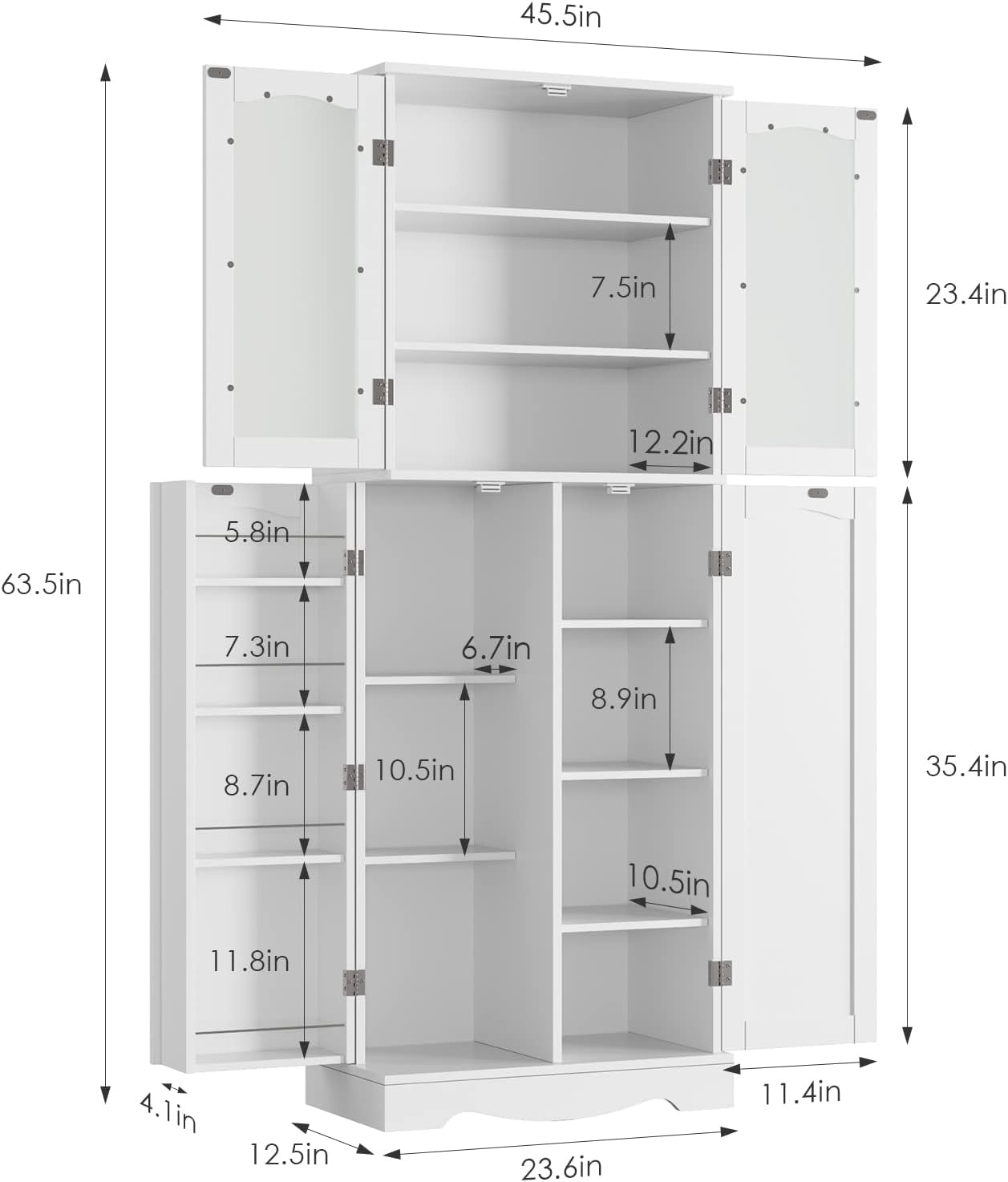 • 【Long-lasting Materials】Constructed from high-quality MDF, the tall pantry with a reinforced wall attachment for stability. With premium white paint craftsmanship, the surface is smooth, waterproof and scratch resistant. Product dimensions: 23.6"L x 12.5" D x 63.5" H